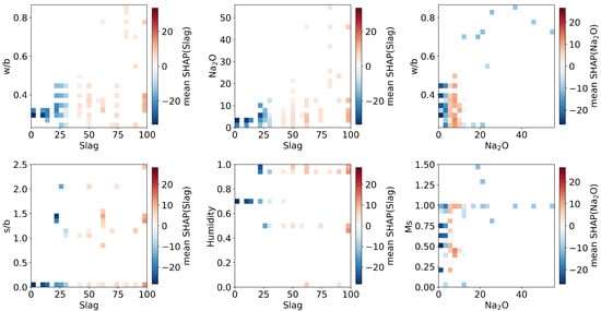 Figure 14 shows the two-dimensional (2D) dependence of the top-six interacting feature pairs for the 28-day compressive strength. Axes display the raw feature values; the colormap encodes the mean SHAP of the x-axis feature, with red indicating a positive contribution to the predicted strength, blue indicating a negative contribution, and pale cells corresponding to bins with few samples. The maps reveal a consistent chemistry–porosity coupling: for Slag × w/b, Slag contributes positively at low w/b and medium–high Slag contents, but its benefit collapses and can turn negative at high w/b. For Slag × Na2O, increasing Slag is most effective at moderate Na2O; very low Na2O (or very low Slag) drives the contribution negative. While Slag and Na2O consistently emerged as the dominant factors across ages, it should be noted that the positive effect of Na2O diminishes at higher w/b. Therefore, the recommendation to prioritize Slag and Na2O while controlling w/b reflects an overall trend within the studied ranges rather than a universal rule under all conditions. For Na2O × w/b, Na2O is beneficial under low w/b and moderate Na2O, whereas high w/b suppresses or reverses the effect. For Slag × s/b, positive contributions cluster at low s/b, implying filler dilution weakens slag’s benefit as s/b rises. Slag × Humidity shows a milder coupling in which wetter conditions combined with higher Slag more often yield positive contributions. Finally, Na2O × Ms exhibits a modulus window: Na2O helps most around intermediate Ms, while very low/high Ms or very low Na2O weaken or invert the contribution. These patterns are consistent with the mechanism that alkalinity (Na2O) governs reaction rate, Ca supply (Slag) controls late-age densification, and w/b shapes pore structure. Note that only the 28-day strength is discussed in the main text. The corresponding 2D-dependence plots for the other targets (CS_3d, CS_7d, CS_14d) are provided in the Appendix A (See Figure A1, Figure A2 and Figure A3). In addition, sparsely populated regions in the 2D SHAP dependence maps (pale cells, e.g., high Ms combined with low w/b) rely more on extrapolation than dense data support. Therefore, the SHAP values in these zones should be interpreted with caution, and additional experiments will be needed to validate these trends.