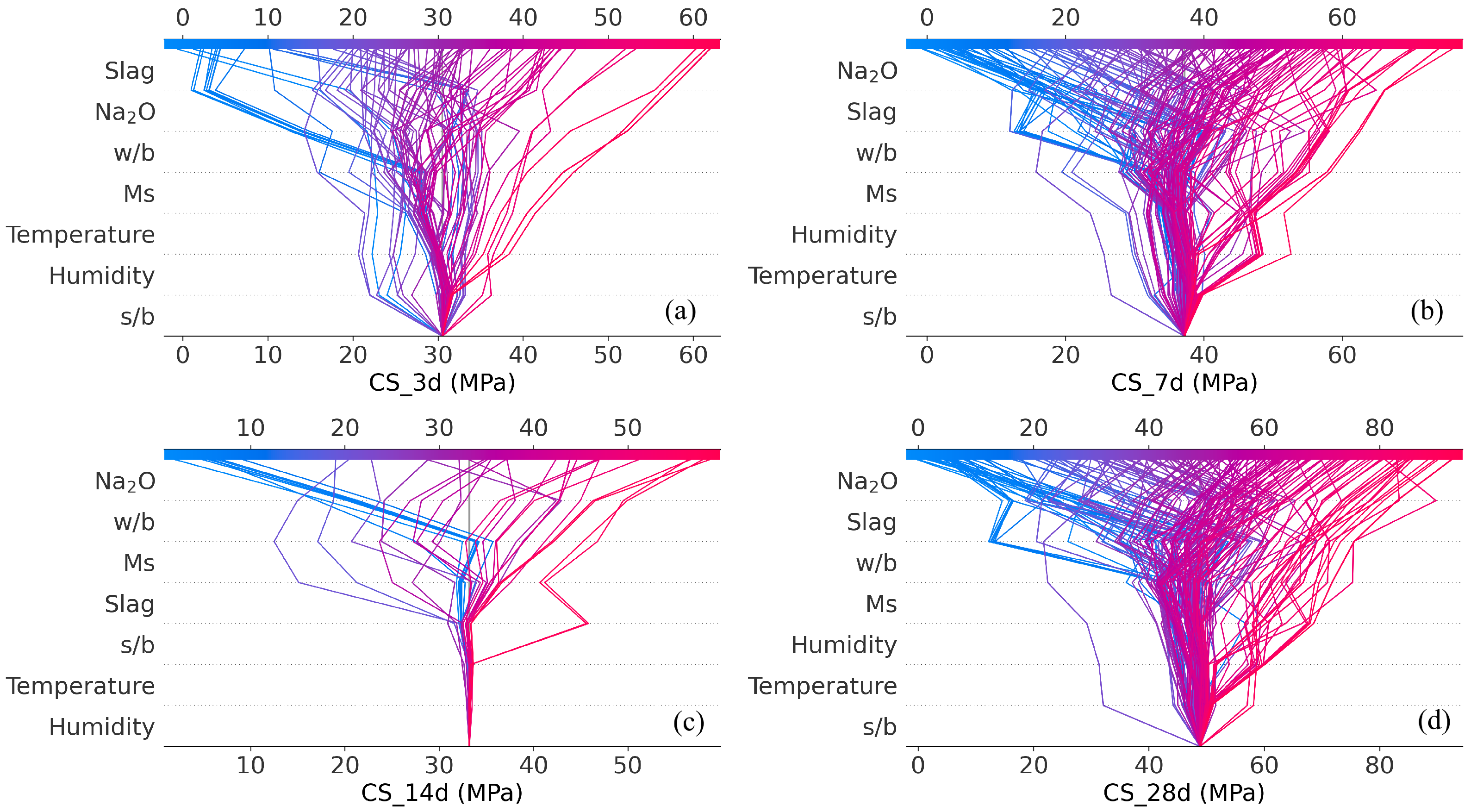 - Output variables: compressive strength at different curing ages–3 days (CS_3d, MPa), 7 days (CS_7d, MPa), 14 days (CS_14d, MPa), and 28 days (CS_28d, MPa) of the OPGs.