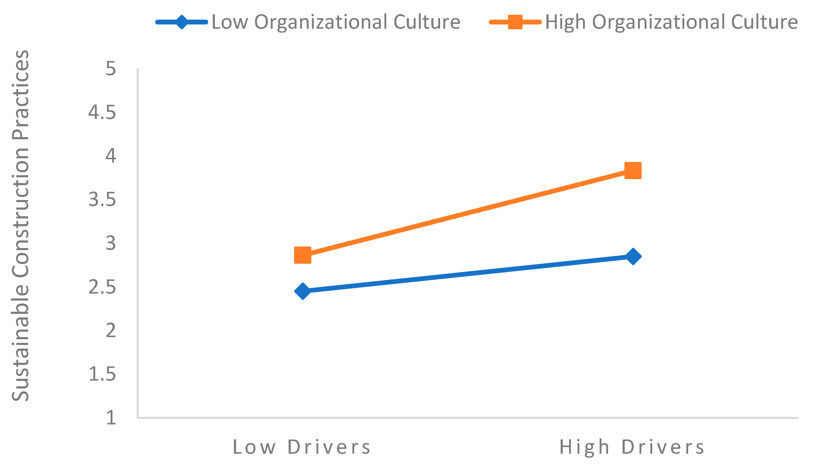 The two-way interaction between drivers and organizational culture on sustainable construction practices is shown in Figure 4. The connection between drivers and sustainable practices is stronger for contractors with a high level of organizational culture compared to those with a low level of organizational culture. A high organizational culture results in a steeper slope, indicating that any increase in drivers leads to a significant rise in sustainable practices.