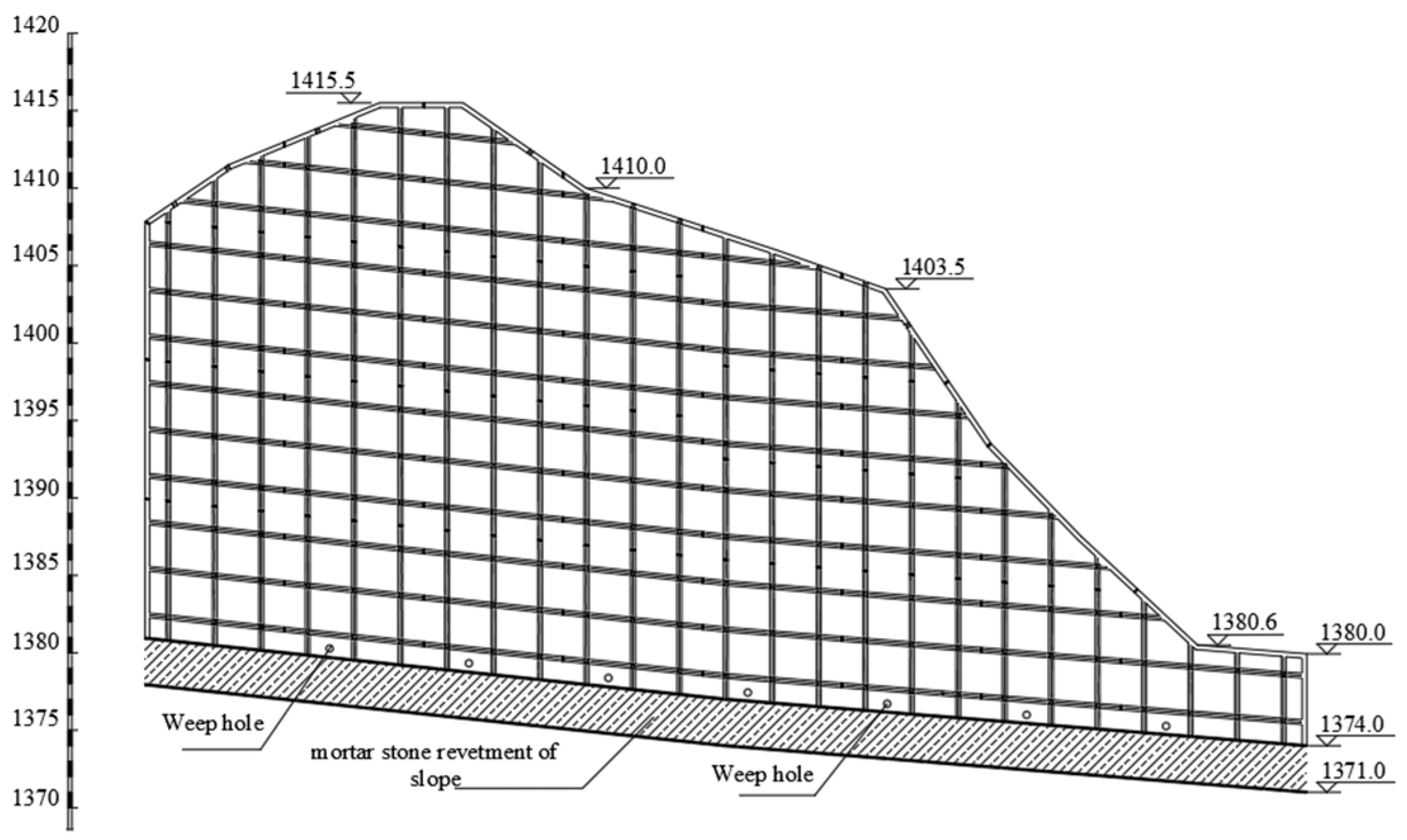 - Zhu, Y.; Wei, Z.; Yang, X.; Zhu, Q. Monitoring and analysis of multi-stage high fill slope supported by prestressed anchor cable pile-slab wall. China Rural. Water Conserv. Hydropower 2020, 7, 202–207. [Google Scholar]