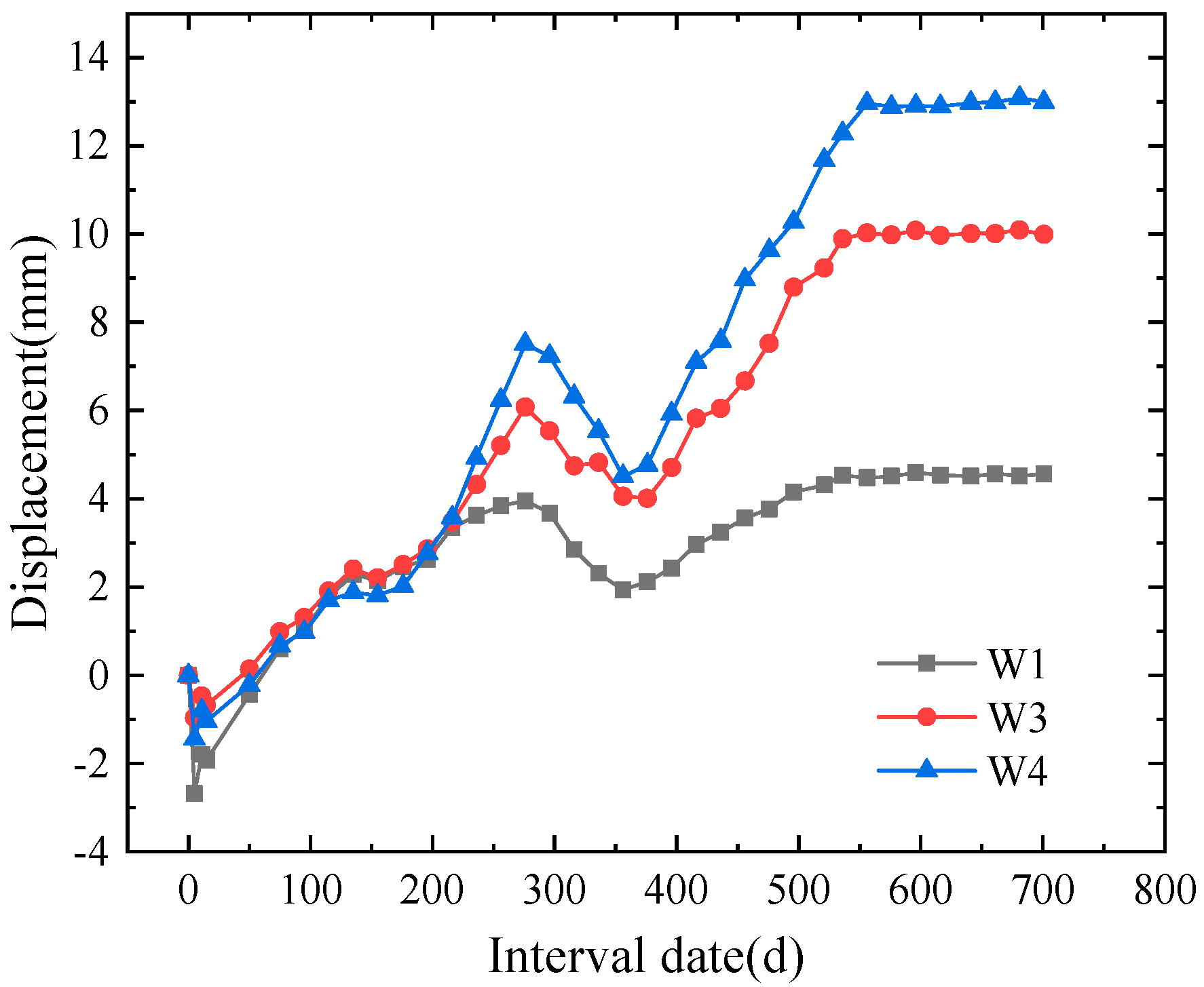 5.3.2. Analysis of the Effect of the Slope Level on the Horizontal Displacement of the Slope