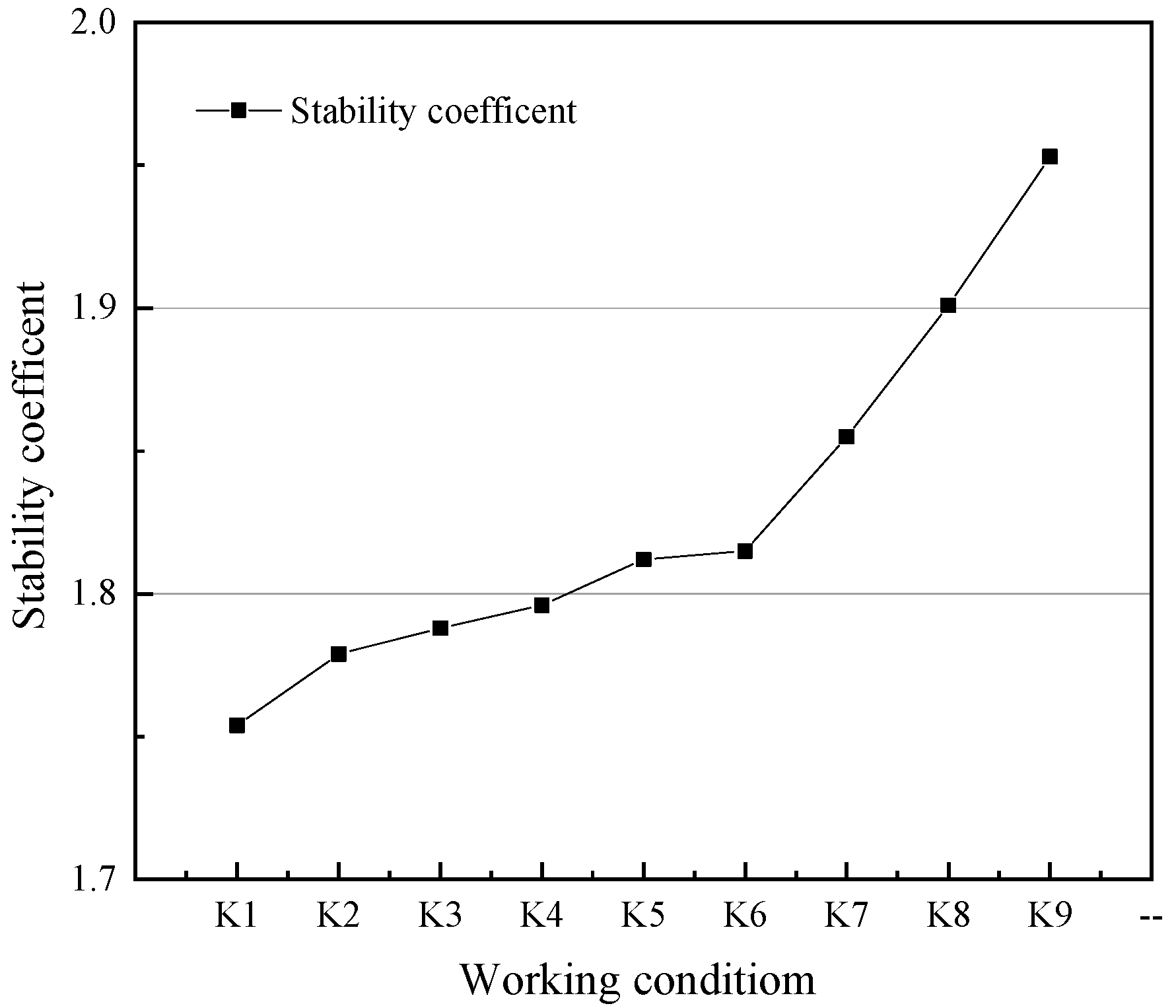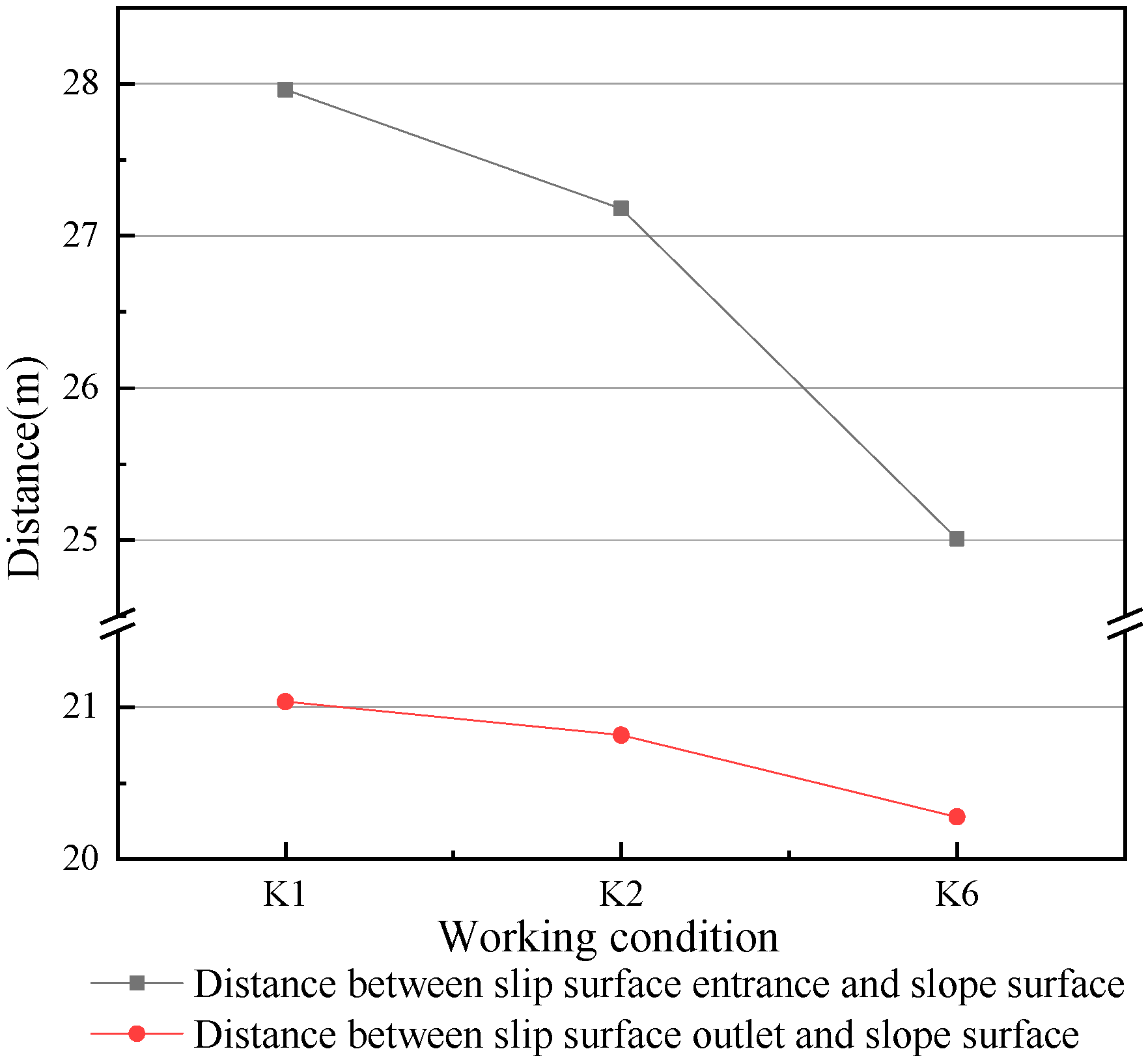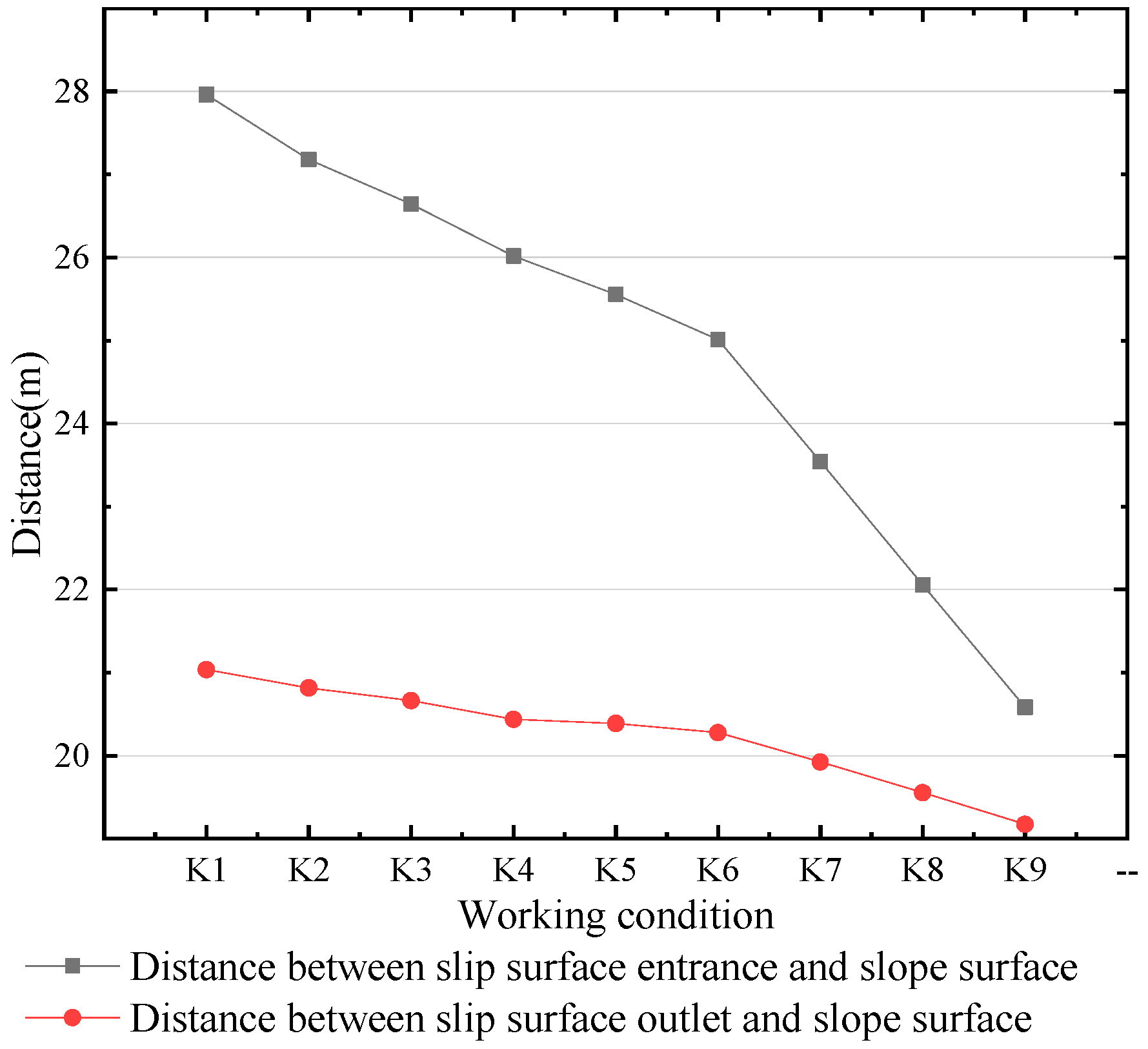 Working Condition | Coefficient of Stability | The Distance Between the Entrance of Sliding Surface and the Slope Surface (m) | The Distance Between the Sliding Surface Outlet and the Slope Surface (m) |