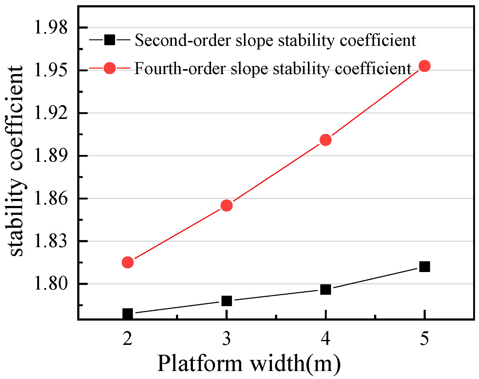 - The findings show that combining multi-stage slopes with frame prestressed anchor cables yields greater stability than direct support and increases the slope stability coefficient. Compared with increasing the width of the platform, increasing the number of slope grades is more effective in enhancing slope stability. The distance between the entrance and exit of the overall slip surface of the slope and the slope surface will also decrease with the increase in the slope classification and the width of the platform. If the site conditions permit, increasing the classification can reduce the distance between the entrance and exit of the overall slip surface of the slope and the slope surface, thus greatly increasing overall slope stability.