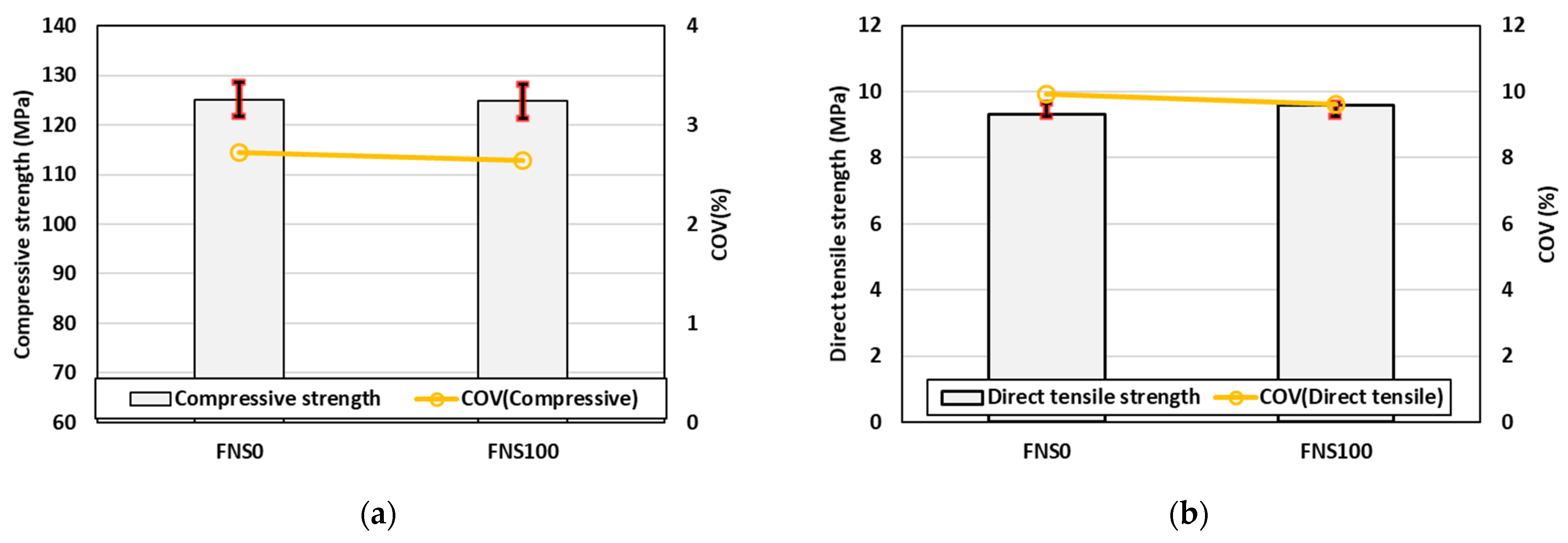 - As a result of compressive and direct tensile strength evaluations of specimens subjected to 48-h steam curing, it was determined that FNS100 (100% GGBFS replacement with FNS) had compressive and direct tensile strengths equivalent to those of FNS0. Furthermore, FNS100 exhibited a 14.7% increase in flow compared to FNS0, indicating improved workability.