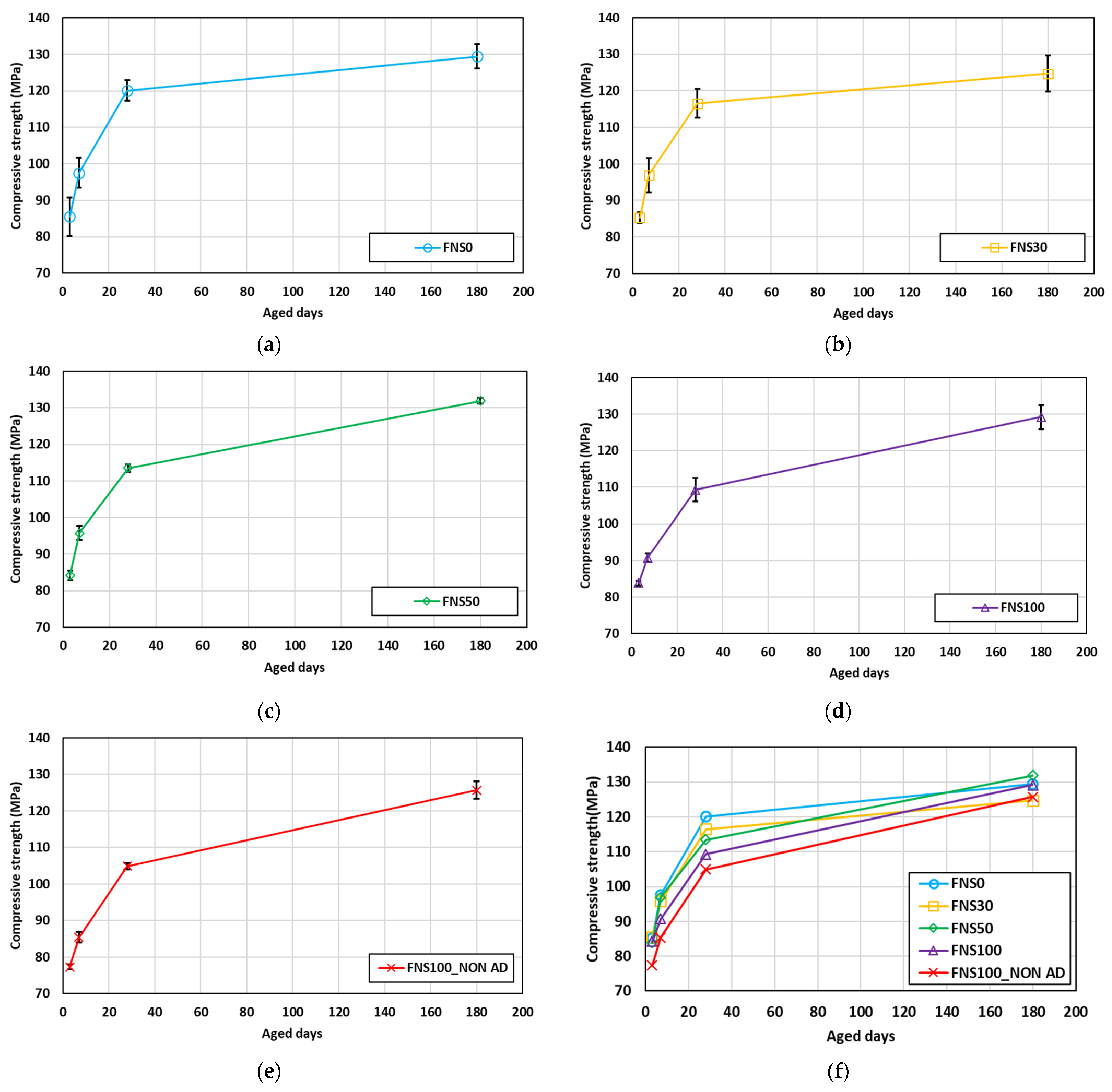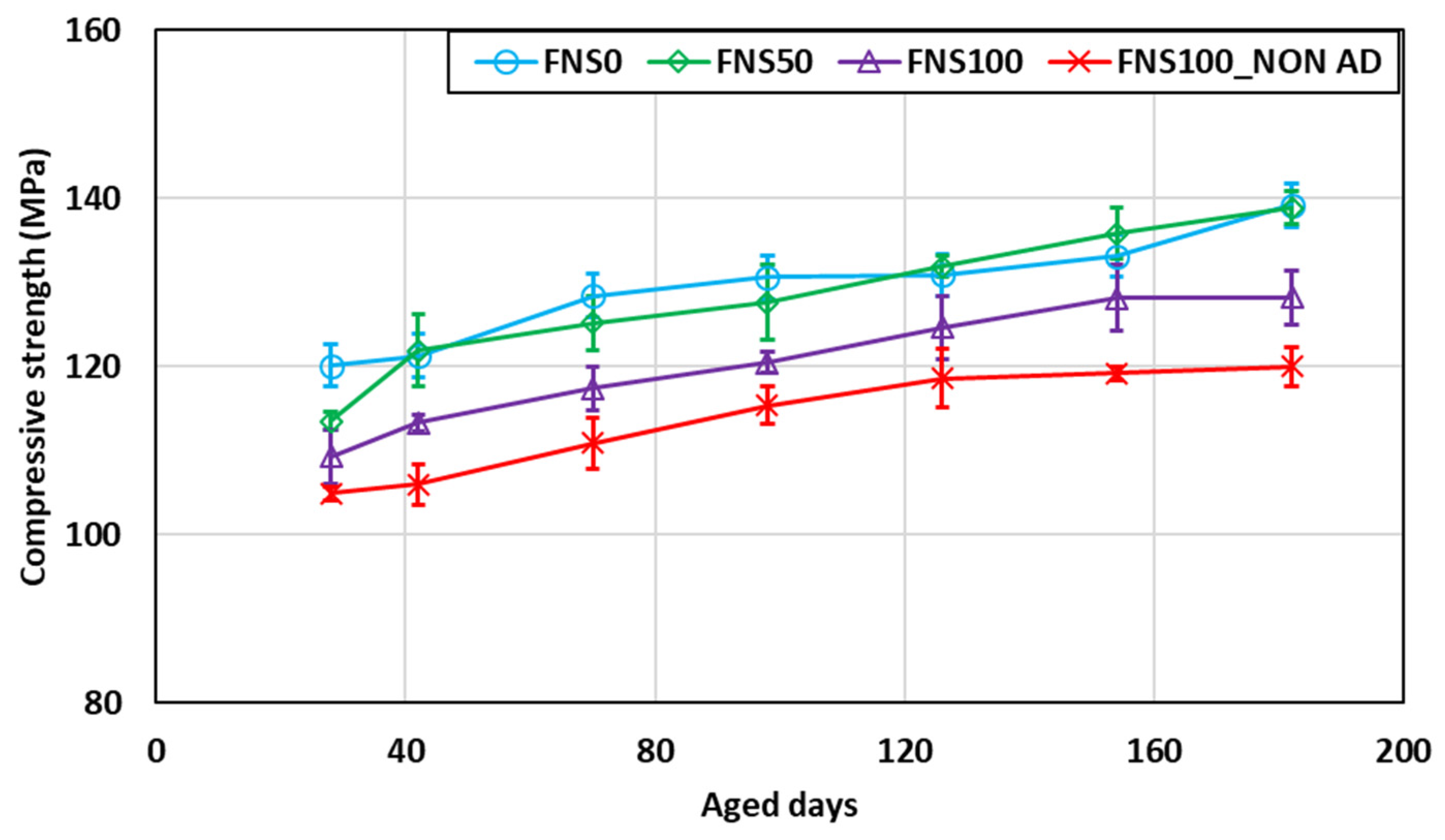 Compressive Strength | FNS0, FNS30, FNS50, FNS100, FNS100-NON_AD | Constant temperature and humidity | 3, 7, 28, and 180 days 23 ± 2 °C, RH 50 ± 5% |