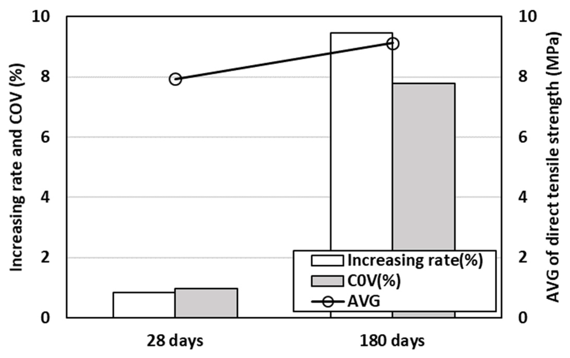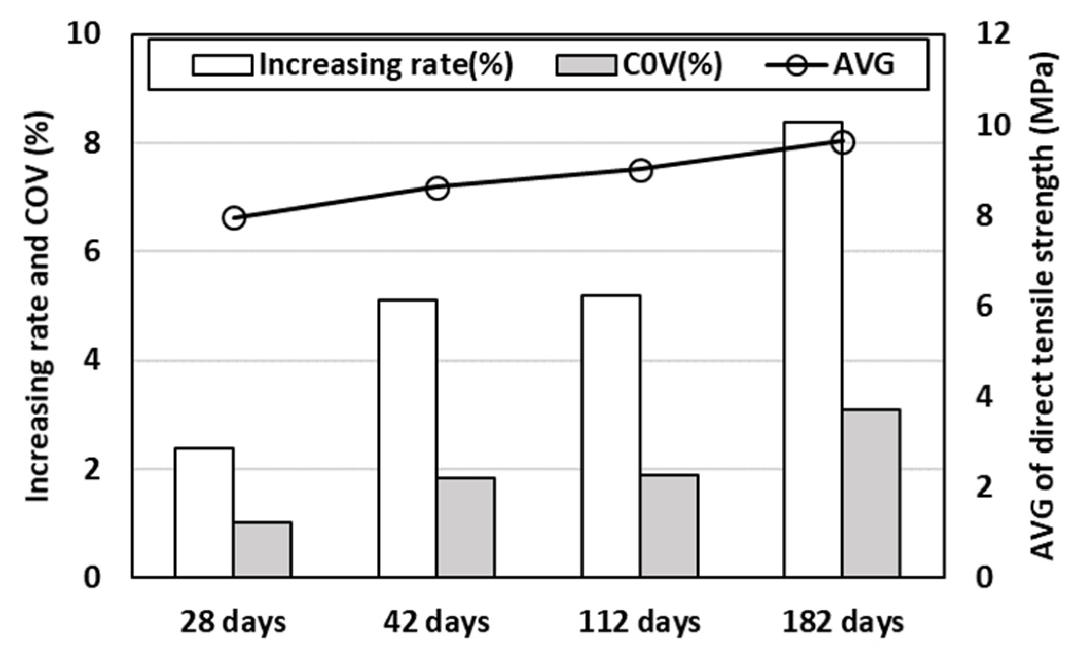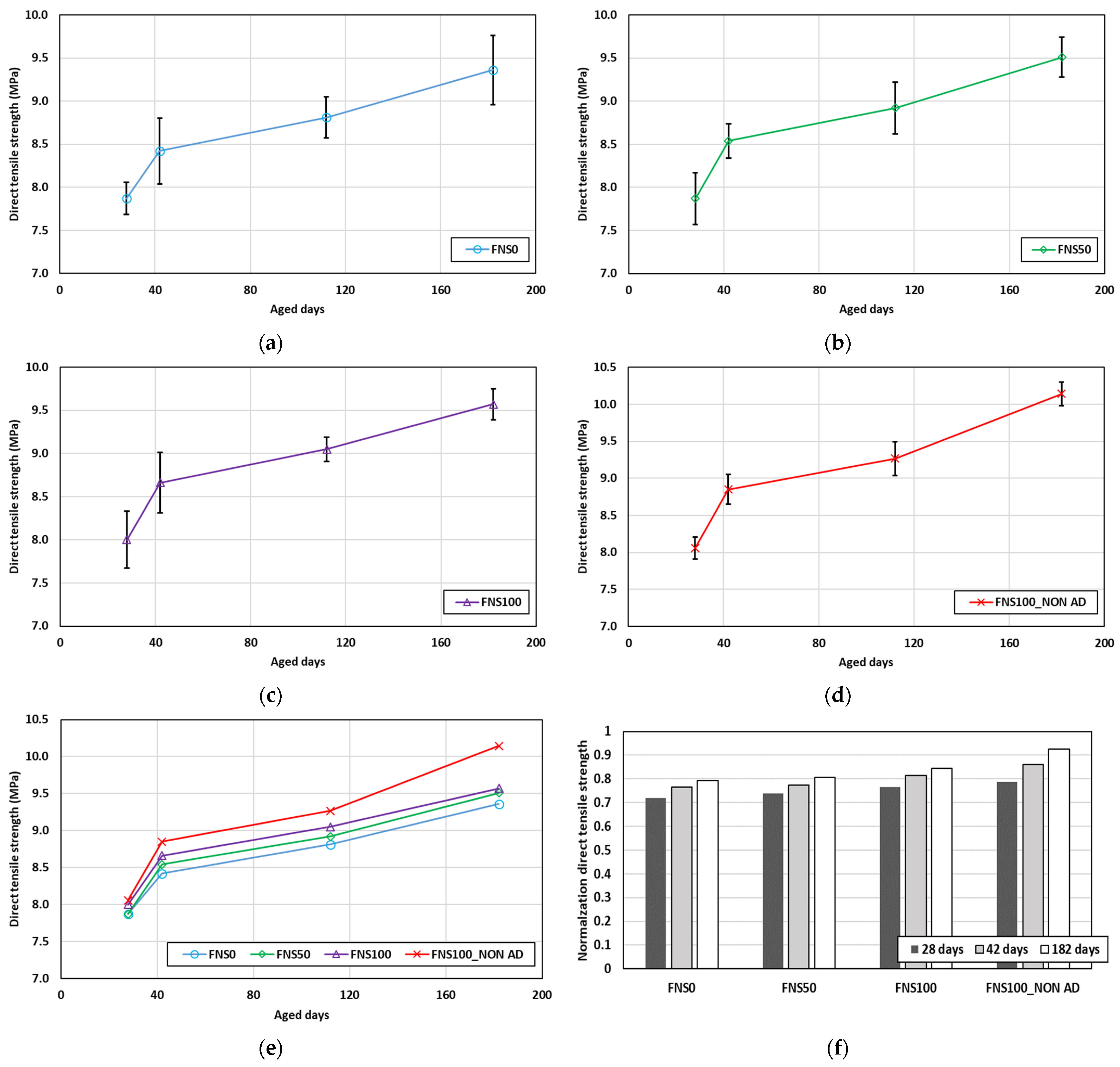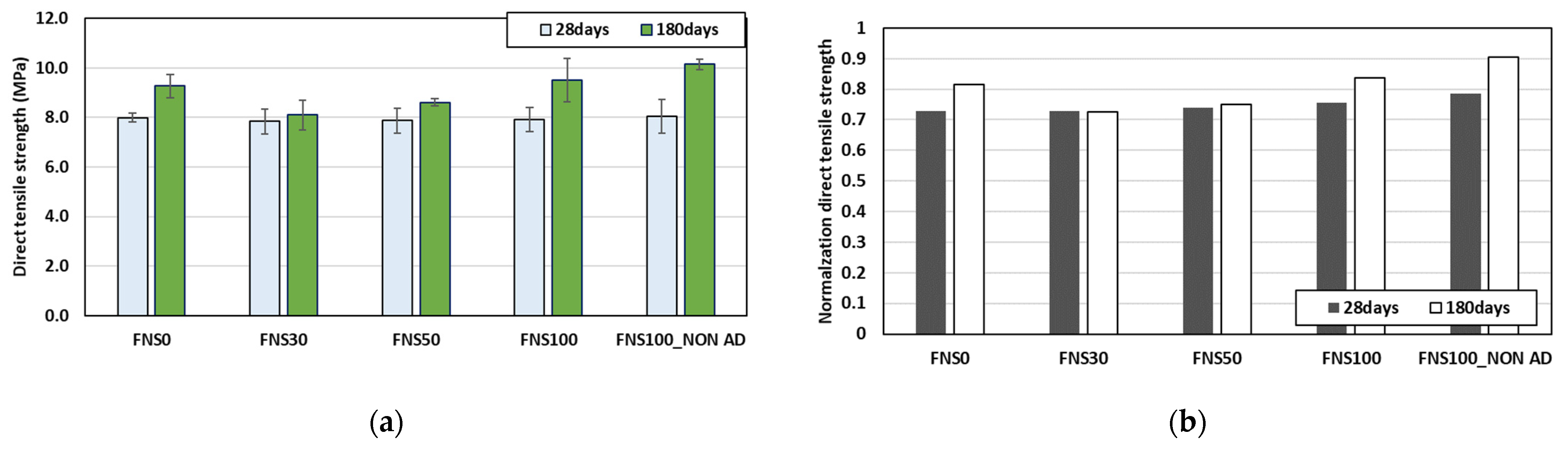 - Mechanical property evaluations under constant-temperature and constant-humidity curing revealed a slight decrease in compressive strength during the initial curing period with higher FNS replacement rates. However, by 180 days, all mixes satisfied the design strength criteria, and strength variability with FNS replacement decreased. Direct tensile strength showed minimal variation (COV < 1%) at 28 days but significantly increased to 6.2% by 180 days. This increase was primarily due to a significant tensile strength gain in FNS100_NON AD, which lacked expansion or shrinkage-reducing agents.