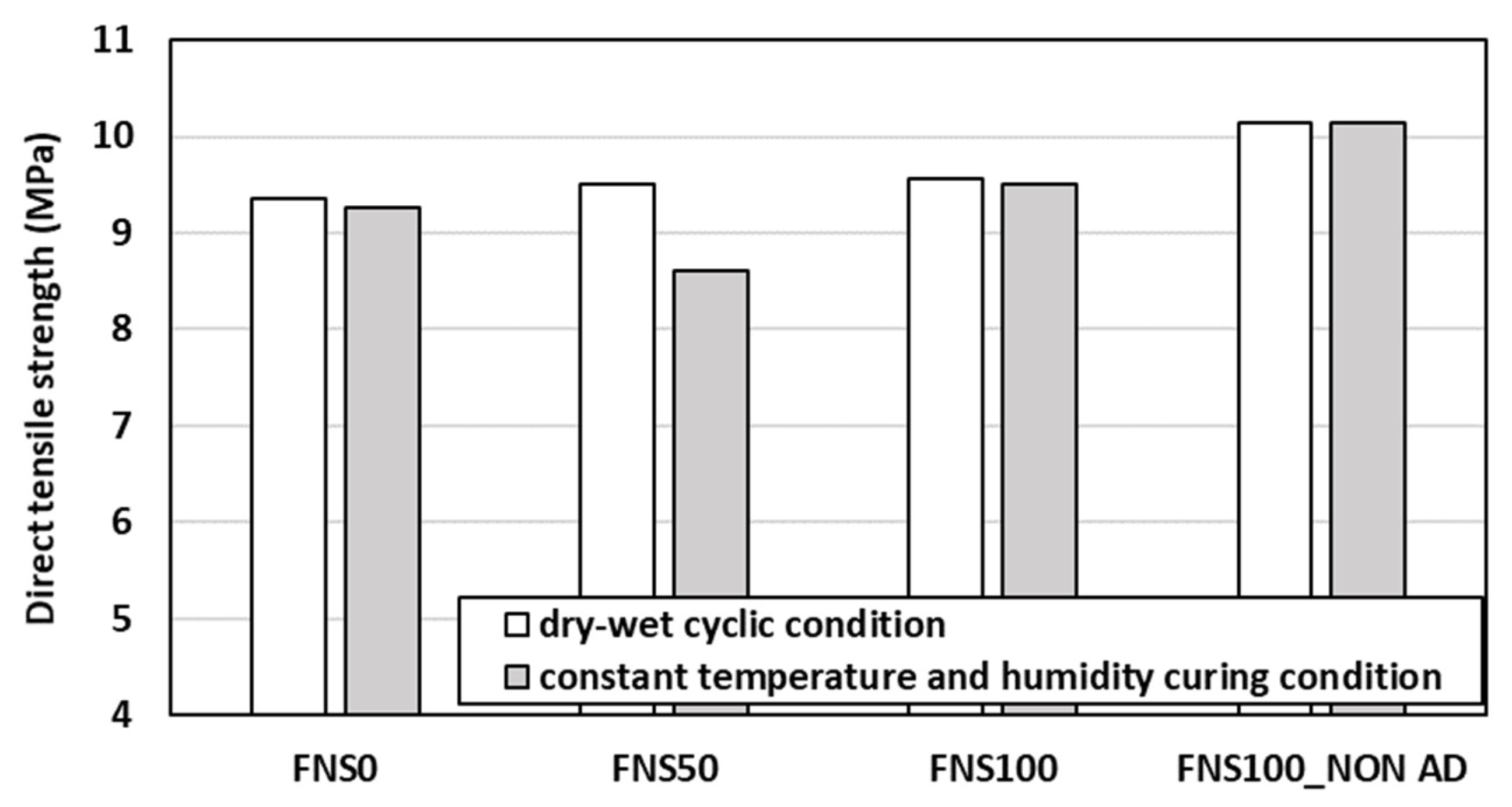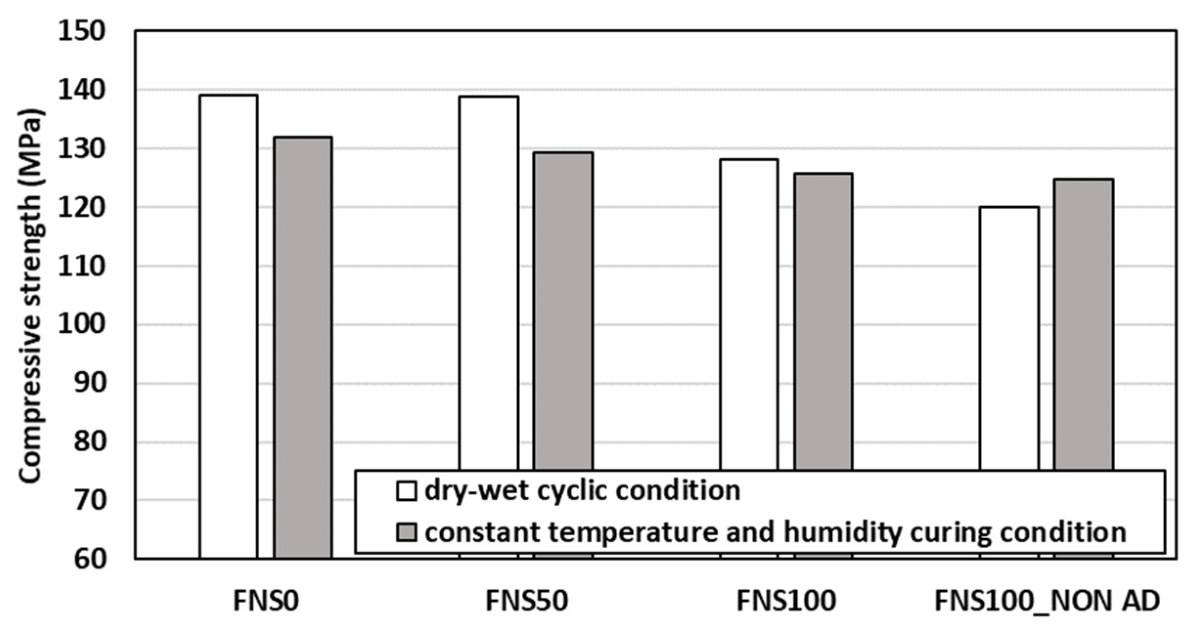 FNS0, FNS50, FNS100, FNS100-NON_AD | Dry/wet | 28, 42, 70, 98, 126, 154, and 182 days Pouring: 28 days; 23 ± 2 °C, RH 50 ± 5% 28–182 days: Immersion in water and exposure to air (23 ± 2 °C, RH 50 ± 5%), applied alternately at 7-day intervals | |