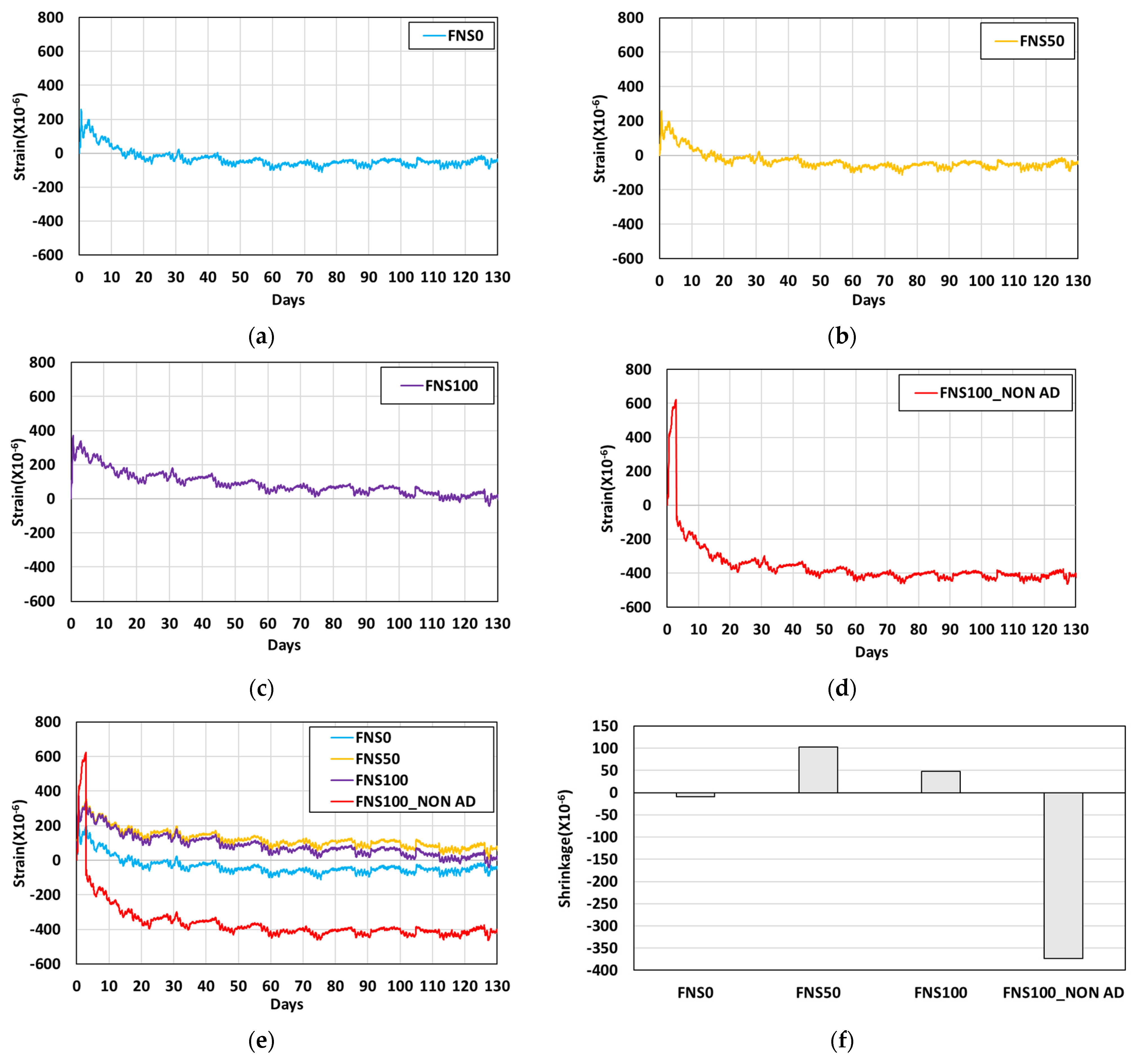 Shrinkage | FNS0, FNS30, FNS50, FNS100, FNS100-NON_AD | Constant temperature and humidity | Pouring: 90 days; 23 ± 2 °C, RH 50 ± 5% * |