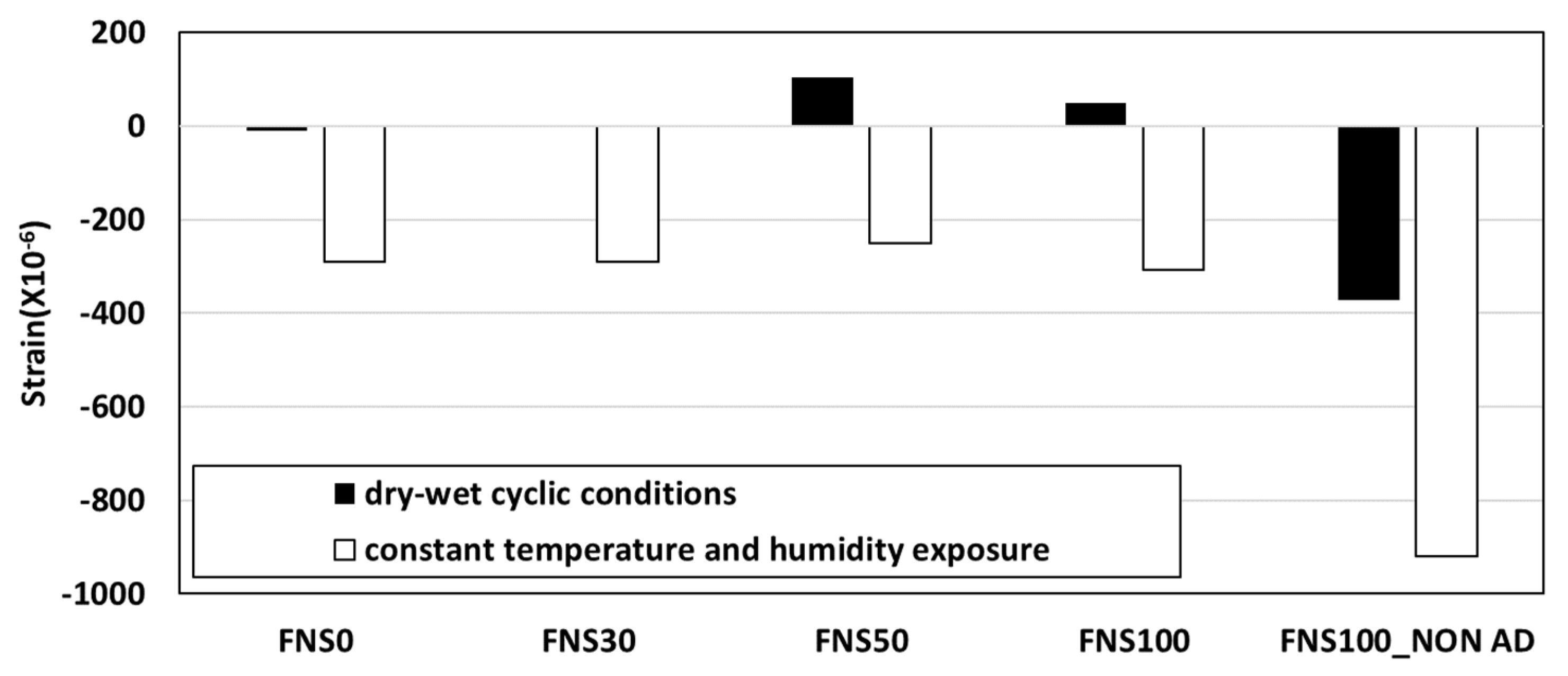 FNS0, FNS50, FNS100, FNS100-NON_AD | Dry/wet | Pouring: 28 days; 23 ± 2 °C and RH 50 ± 5% 28–130 days: Immersion in water and exposure to air (23 ± 2 °C, RH 50 ± 5%), applied alternately at 7-day intervals |