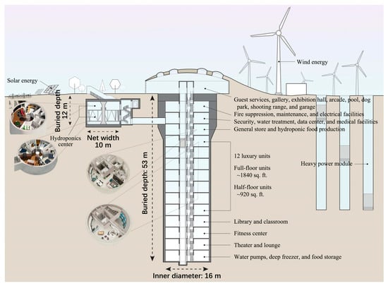 Moving towards DUS—an environment with greater complexity and extremity—has become a new trend in spatial exploration and the realization of human sustainable development [,]. Compared with aboveground and shallow underground spaces, DUS possesses unique advantages in development and utilization. Practical cases of transforming DUS into habitable spaces include the Derinkuyu Underground City (85 m underground), dating back to the 8th century BCE [], and the Survival Condo in the United States (see Figure 2 and Table A1)—transformed from mid-20th-century missile silos with a buried depth of 53 m []. Looking to the future, some scholars have attempted to construct a technical system for the habitable environment in DUS [] and have conducted vertical division of spaces from 0 to 2000 m underground, proposing a concept of hierarchical utilization [].