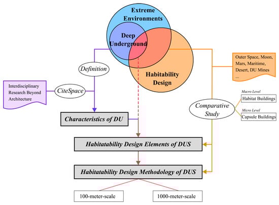 This research framework proceeds as follows: clarifying the definition of DUS and analyzing DU characteristics via CiteSpace-based interdisciplinary research; extracting habitable experiences from typical extreme environments (outer space, etc.) at the macro/micro-scales; and finally, refining DUS habitability design elements and building a scale-differentiated (100 m, 1000 m) design methodology system (Figure 3).