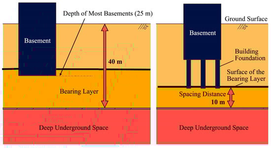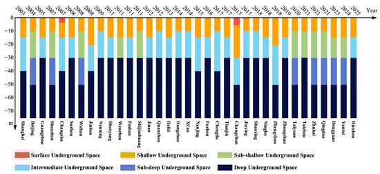 Based on the current global experience in DUS development, the development and utilization modes of DUS vary significantly across different regional environments. Cities in China, as well as countries such as the United States, Russia, Singapore, Finland, and Japan, all have different DUS division methods []. Japan began exploring urban DUS as early as the 1980s [] and has accumulated extensive practical experience in DUS design. By the end of 2023, the annual newly added construction area of urban underground space (UUS) in China reached approximately 312 million square meters, with a year-on-year increase of 17.88%, making China a major country in global UUS development []. As shown in Figure 4 and Figure 5, for the convenience of this research, by sorting out the definitions of DUS from the Ministry of Land, Infrastructure, Transport, and Tourism (MLIT) of Japan and various cities in China, this study defines the depth boundary of DUS as 30 m below the ground surface.