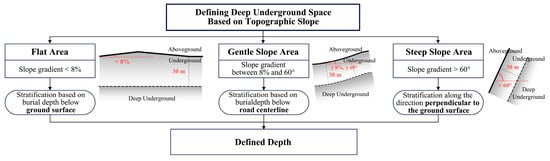 The method of dividing underground space based on buried depth is not applicable in mountainous or sloped areas; instead, such space should be divided by regions based on topographic differences []. Specifically, areas with a ground slope of less than 8% can be regarded as flat areas, and 60° can be used as the boundary for dividing steep slopes and gentle slopes [,]. As shown in Figure 6, under terrains with different slopes, the development of underground space should involve hierarchical division along appropriate directions to optimize the definition and development of DUS.
