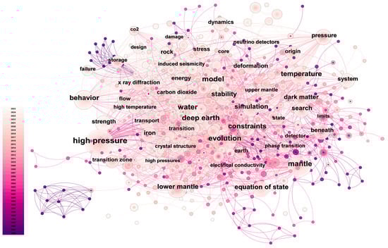 - Visualization Configuration: In the knowledge graph, node size reflects the citation frequency of individual studies (larger nodes indicate higher academic impact); line color represents the time of correlation between studies (enabling observation of research evolution trends); and cluster labels are generated by CiteSpace based on high-frequency keywords within each cluster (e.g., “deep underground geology”, “extreme environment habitability”), clearly identifying core research fields.