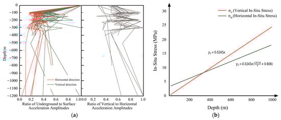 Seismic acceleration (amplitude) and in situ stress variation with depth. (a) Seismic acceleration (amplitude) variation with depth; (b) in situ stress variation with depth.
