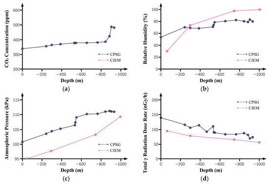 Data on the CO2 concentration, relative humidity, atmospheric pressure, and total γ-radiation dose rate in DUS came from 2019–2020 environmental surveys by China National Gold Group’s Jiapigou Minerals Erdaogou Mine (CJEM) [] and China Pingmei Shenma Group (CPSG) []. These results are presented in Figure 9. The CO2 concentration in DUS remains relatively stable at depths shallower than −900 m but changes abruptly near −1000 m, increasing by 30%. Relative humidity rises with depth: approximately 80% at −1000 m in the 12th Mine of CPSG, while that in CJEM at −1000 m is nearly 100%. The atmospheric pressure in DUS increases with increasing depth, whereas the total γ-radiation dose rate in DUS decreases with increasing depth.