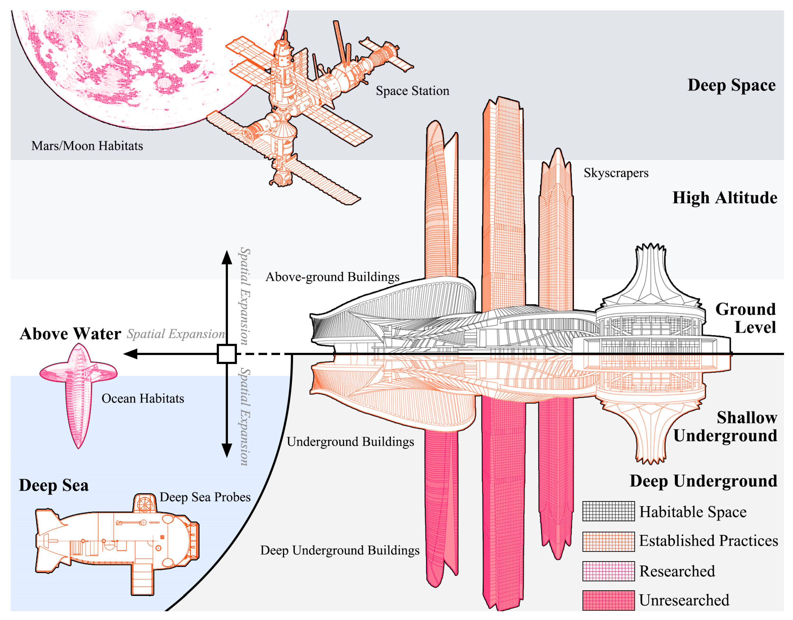 - How can we extract and organize a core habitability design element system exclusive to the architectural field by synthesizing interdisciplinary DUS research (e.g., geology, medicine) and comparing habitability experiences from other extreme environments (e.g., space stations, lunar habitats)?