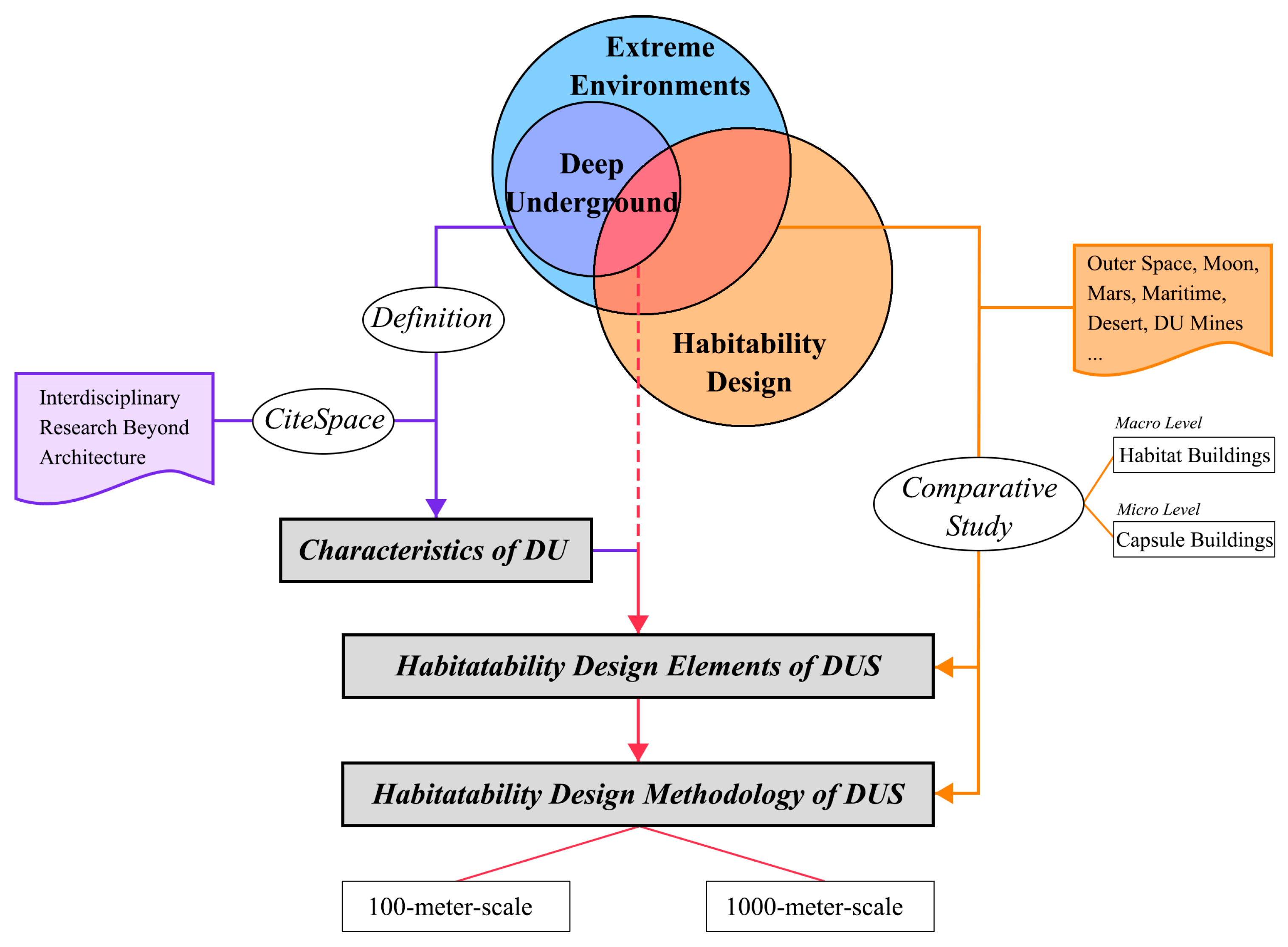 - How can we construct a demand-oriented DUS habitability design methodology that accounts for scale differences (100 m vs. 1000 m levels) to fill the research gap in architectural design for long-term deep underground habitation?