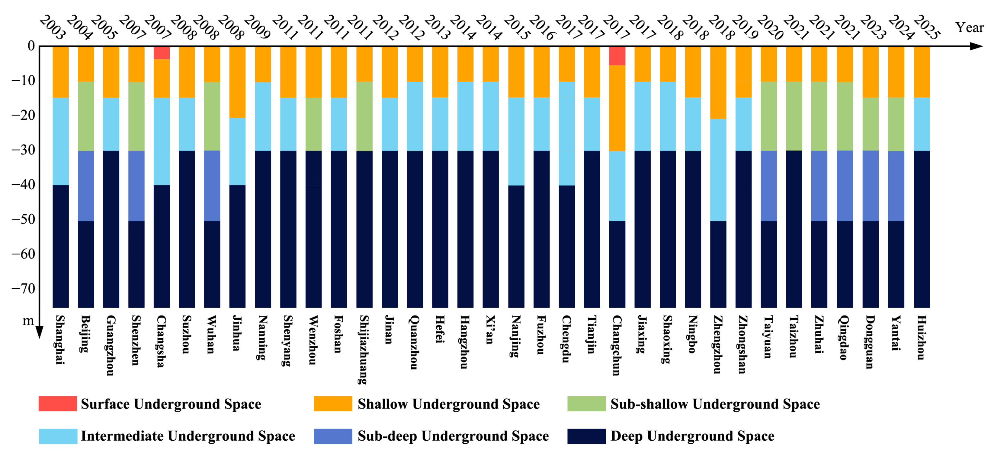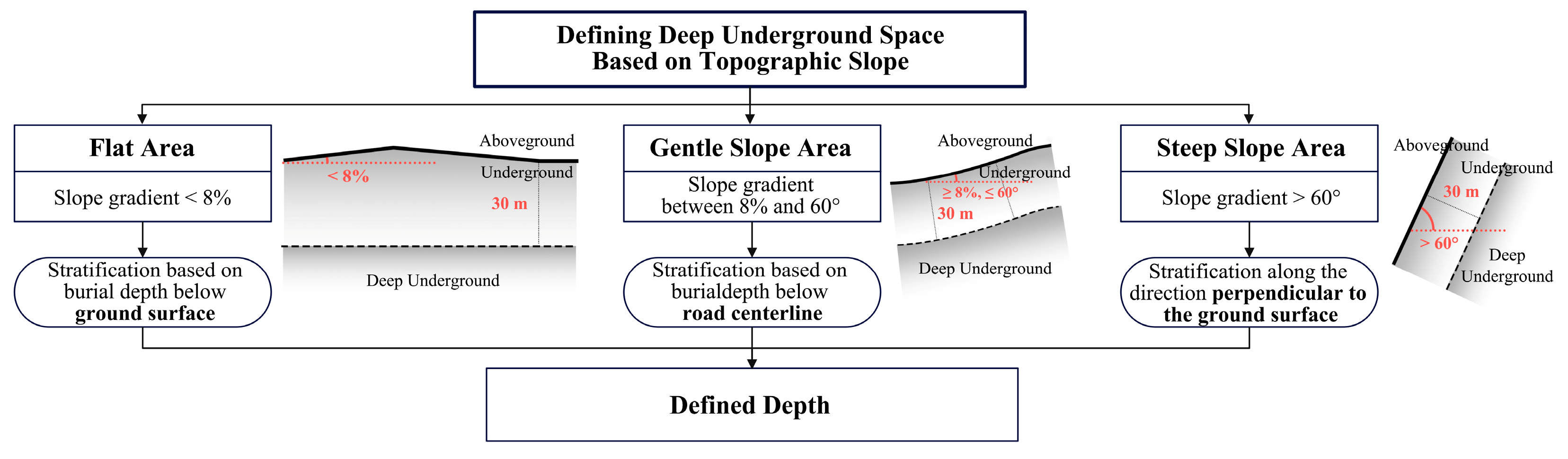 - Clarifying the characteristics and definition criteria of DUS: Based on Japan’s MLIT and China’s urban planning practices, this study defines the depth of DUS as 30 m below the ground surface. It also optimizes the classification logic by integrating topographic slope, solving the definition problem of underground space development in mountainous areas. Through a survey of geological data from 28 major cities in China, the core environmental parameters of DUS are quantified, and its derived characteristics (e.g., closed isolation and irreversible development) are clarified—laying a foundation for the subsequent proposal of design methods.