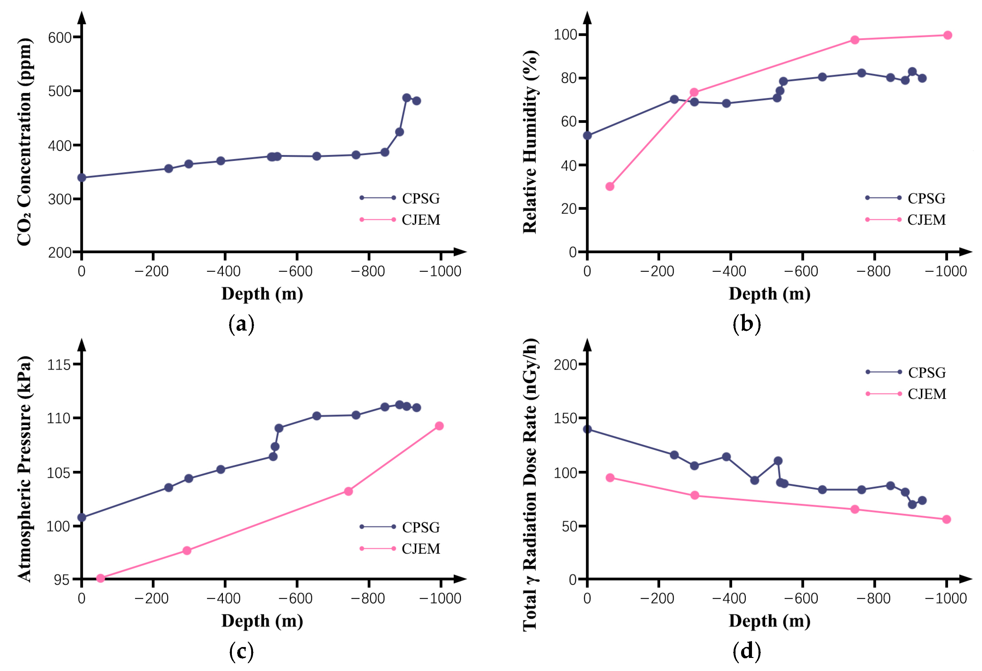 - Additional adaptations based on depth scales: For the 100 m scale DUS (−30~−100 m), taking cities in Table 2 as examples, cities such as Nanjing and Hangzhou (with a CTZT of 17.9~19.6 °C and a geothermal gradient of 1.9~3.4 °C/100 m) can leverage their natural constant temperature property to optimize spatial heat exchange efficiency, eliminating the need for additional large-scale temperature control equipment. For the 1000 m scale DUS (below −100 m), quantitative data indicate notably extreme environmental conditions. According to Figure 8, the relative humidity at this depth ranges from 80% to 100%, and the CO2 concentration at −1000 m increases abruptly by approximately 30%. Therefore, it is necessary to configure a constant temperature and humidity system with a dehumidification capacity of no less than 5 kg/(h·100 m2), and adopt variable-frequency ventilation to control the CO2 concentration at ≤1000 ppms [82,103,104].