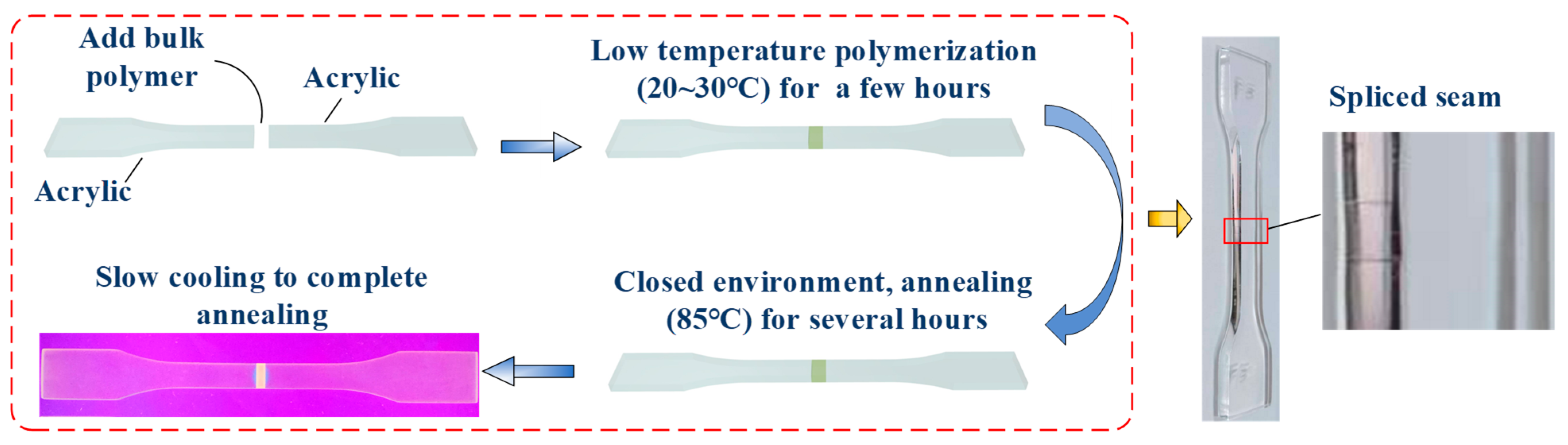 In structural engineering, acrylic components often require large sizes and complex shapes, such as curved or folded surfaces [14]. However, industrial-grade acrylic is limited by manufacturing equipment, necessitating a modular fabrication strategy: small acrylic panels are produced and then joined into larger assemblies via bulk polymerization splicing. The bulk polymerization splicing process for structural acrylic comprises [15] (Figure 2): (a) Maintaining a gap between two acrylic plates and injecting methyl methacrylate (MMA) monomer; (b) Sealing the seam and resting the assembly at 20 °C for several hours to remove bubbles; (c) Applying thermal treatment at 85 °C for several hours to complete polymerization and annealing. Since the monomer (MMA) used in the bulk polymerization is identical to the base acrylic material, the spliced seam is optically transparent and visually indistinguishable from the base material. Moreover, the mechanical strength of the connected seam can exceed 80% of the base material strength, enabling the entire acrylic structure to function as a continuous load-bearing system. Typical acrylic component splicing is conducted in a controlled high-temperature environment within the factory. When panel dimensions exceed transport limits, sections are shipped and spliced on site. However, on-site splicing often fails to reach the required 85 °C annealing temperature at some seam locations.