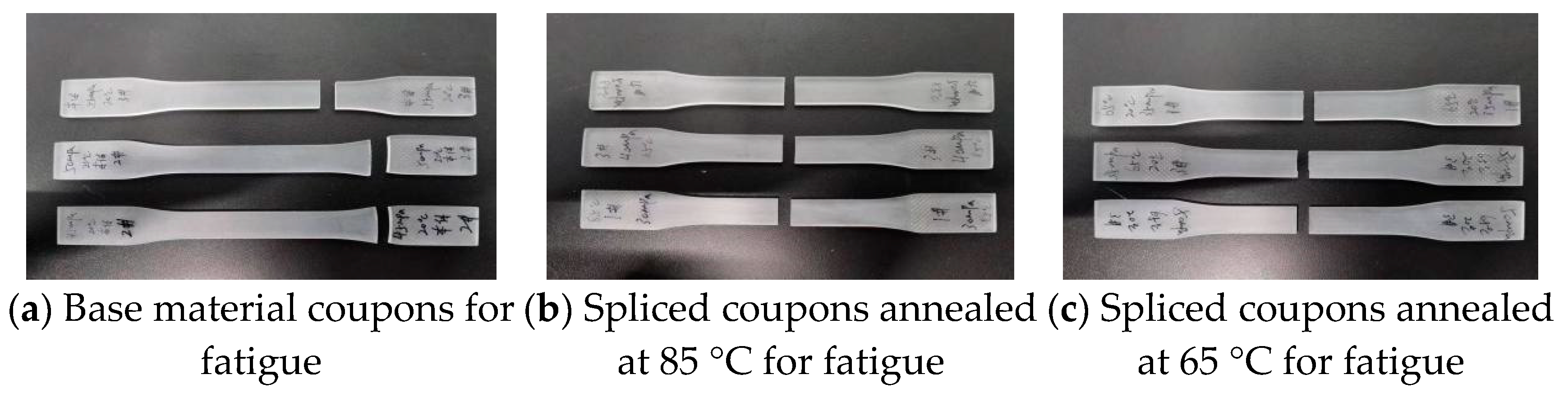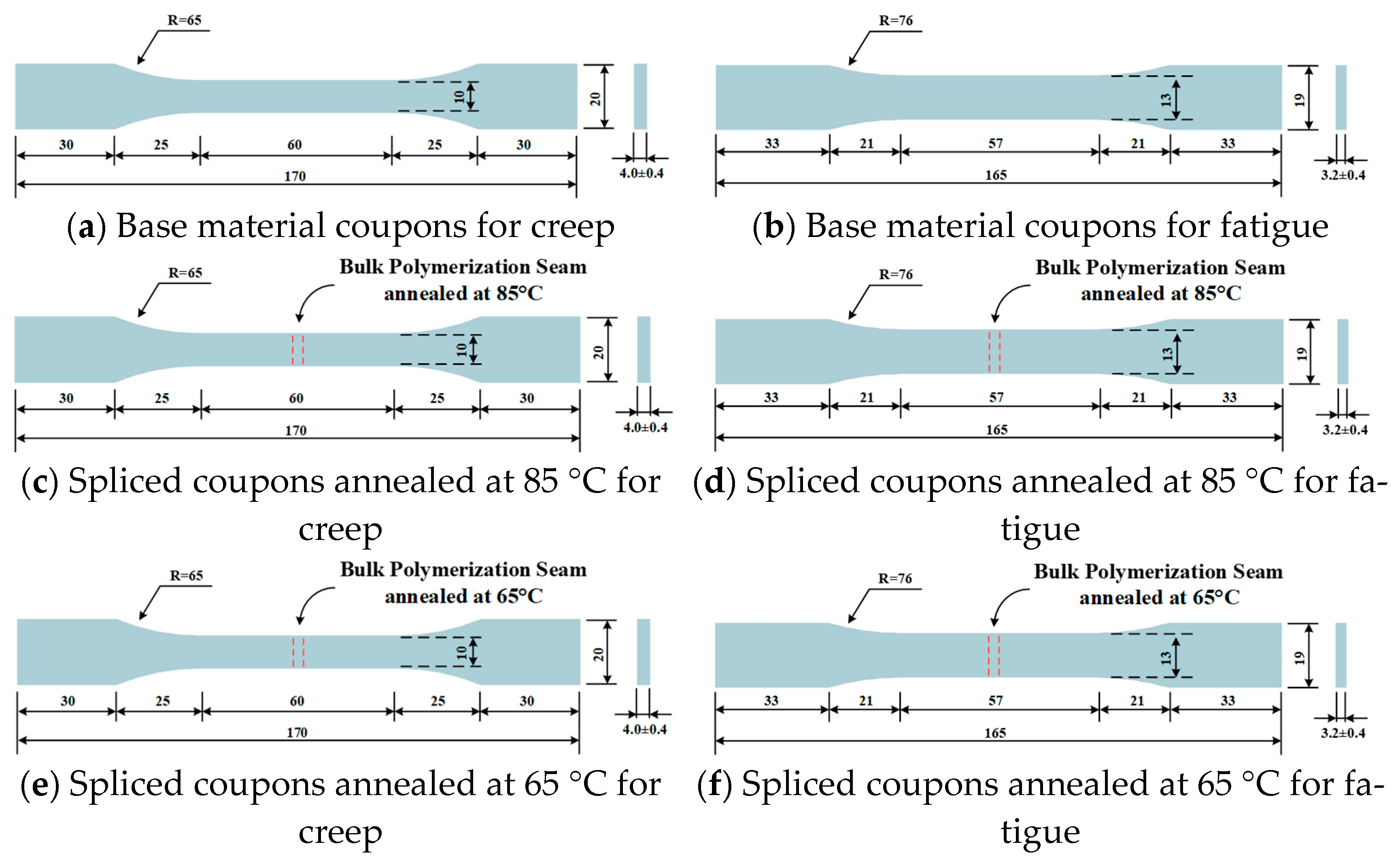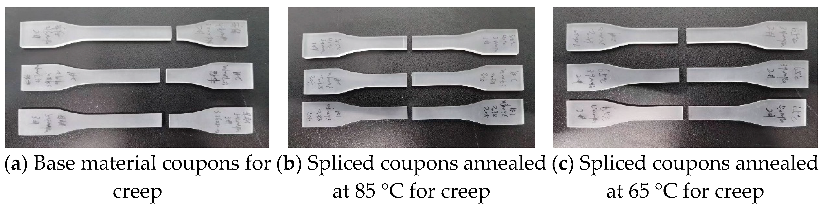 To investigate the effect of annealing temperature on creep and fatigue life of structural acrylic, three coupon groups were prepared: spliced coupons annealed at 85 °C (85-CSC for creep, 85-FSC for fatigue), spliced coupons annealed at 65 °C (65-CSC for creep, 65-FSC for fatigue), and base material coupons (CBC for creep, FBC for fatigue). A spliced coupon annealed at 85 °C refers to a coupon spliced through bulk polymerization under an annealing temperature of 85 °C. Similarly, a spliced coupon annealed at 65 °C is a coupon spliced under an annealing temperature of 65 °C. The spliced coupons annealed at 65 °C simulate on-site polymerization under suboptimal thermal conditions, since field measurements show temperatures can drop to approximately 65 °C. This study included acrylic base material coupons as controls to quantify the extent to which annealing temperature affects creep and fatigue life.