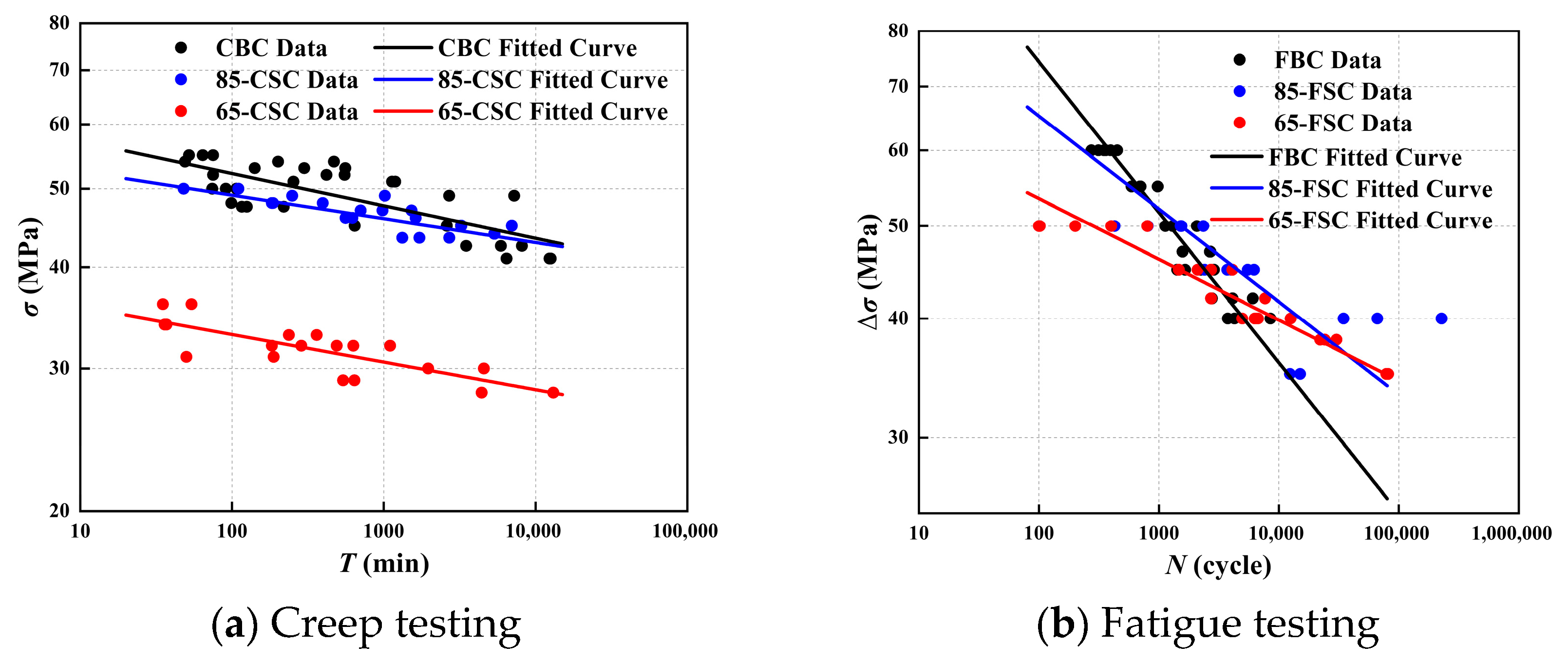 In the tensile creep tests, 33 valid creep fracture data points were obtained for the CBC, with 20 and 19 for the 85-CSC and 65-CSC, respectively. In the tensile fatigue tests, 29 valid fatigue fracture data points were obtained for the FBC, and 15 and 23 for the 85-FSC and 65-FSC, respectively. Some data points were excluded from the analysis for two main reasons: (a) tests terminated without fracture due to a creep duration exceeding 15 days or a fatigue cycle count exceeding 1 × 105 cycles; (b) data invalidated by incidental factors, such as excessive load deviation in the testing apparatus.