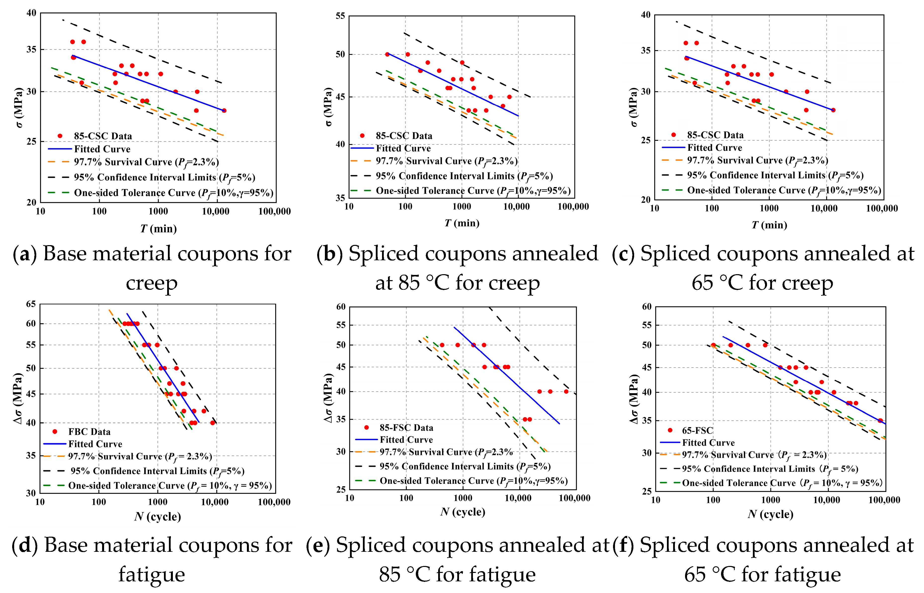 At the 95% confidence level, the degrees of freedom (n − 1) were used to determine the critical t-value t0.025, yielding tCBC = 2.04, t85-CSC = 2.10, t65-CSC = 2.11 for creep coupons, and tFBC = 2.05, t85-FSC = 2.16, t65-FSC = 2.08 for fatigue coupons. These t-values were then substituted into Equation (7), in combination with Equation (5), to compute the confidence intervals for creep and fatigue life curves. The lower bound of the confidence interval corresponds to a confidence level γ of 97.5%. The equations for the lower confidence bounds are presented as Equations (8) and (9). The upper and lower confidence limits are plotted in Figure 7.
