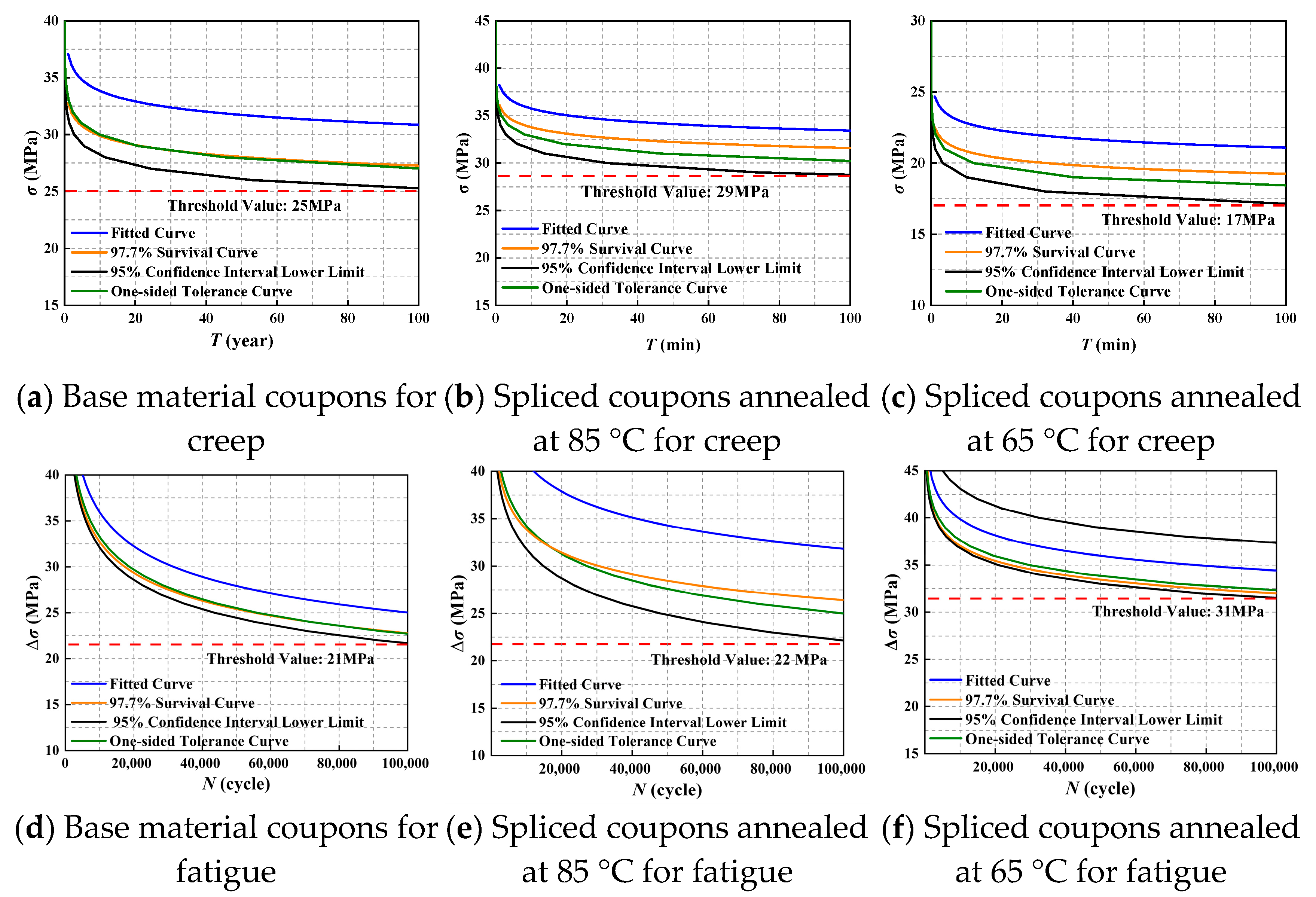 The predicted trends of the creep and fatigue life curves, as well as the three types of design curves for structural acrylic coupon, in the low-stress region are plotted in Figure 8. It is observed that the 95% confidence interval lower limit provides significantly lower life predictions than both the one-sided tolerance curve and the 97.7% survival curve. A notable threshold effect is revealed in the relationship between life and creep stress (or stress amplitude). By taking 100 years as the limiting creep life and 1 × 105 cycles as the limiting fatigue life, it can be inferred that failures will not occur under stress levels for which the predicted creep life exceeds 100 years or the predicted fatigue life exceeds 1 × 105 cycles. Such levels are defined as the creep threshold stress and the fatigue threshold stress below which damage accumulation is negligible over the service life, respectively. The creep threshold values for the CBC, 85-CSC, and 65-CSC coupons are 25 MPa, 29 MPa, and 17 MPa, respectively. The corresponding fatigue threshold values for the FBC, 85-FSC, and 65-FSC coupons are 21 MPa, 22 MPa, and 31 MPa, respectively.