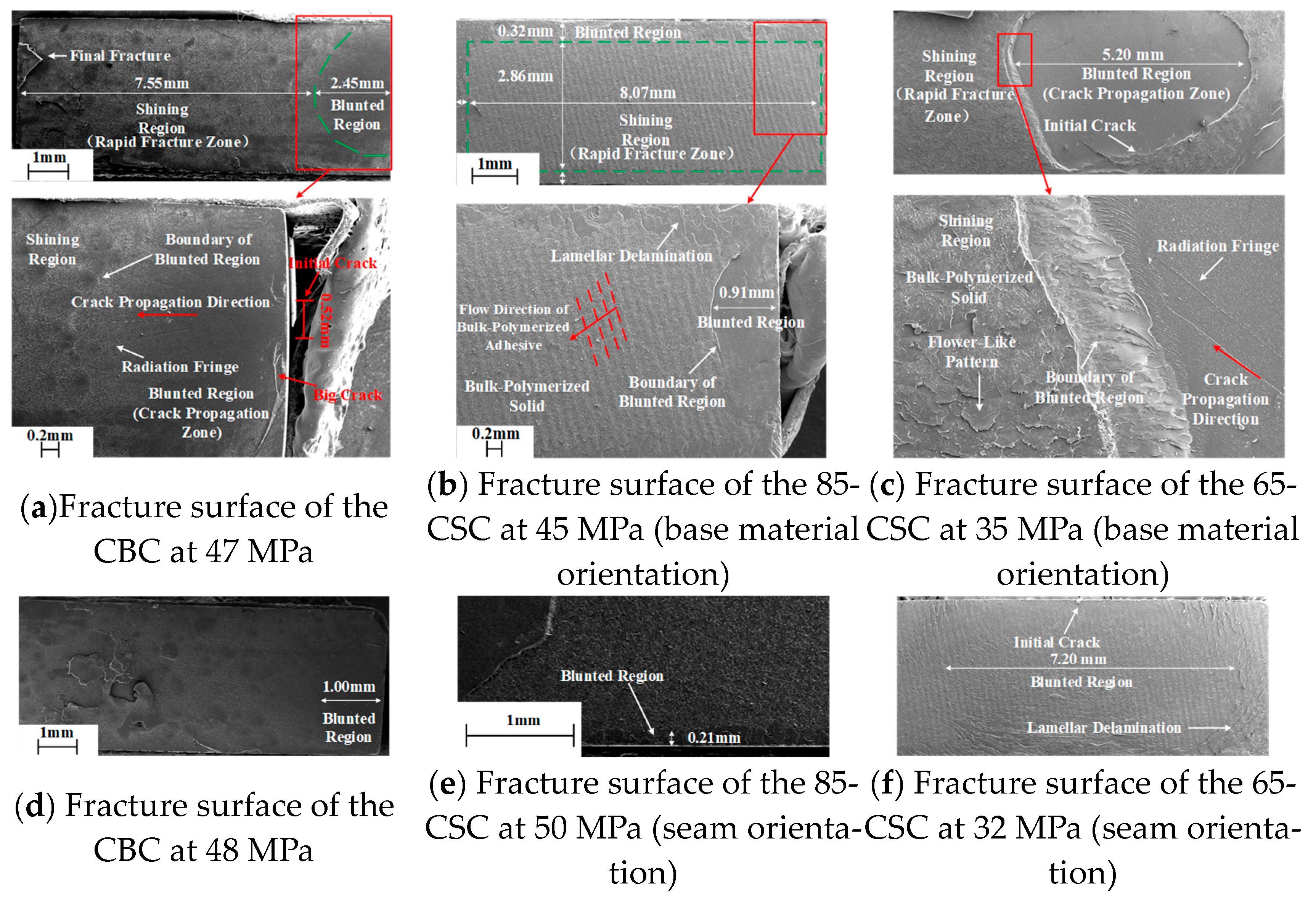 Figure 11b presents the SEM micrograph of the fracture surface of the 85-FSC under a stress amplitude of 45 MPa. Fatigue failure was found to initiate within the adhesive seam, in contrast to its failure behavior under creep stress. A blunted region with a radius of approximately 1.96 mm was defined. Within the shining region, the fracture surface exhibited complex lamellar delamination features. A distinct transition zone between the shining and blunted regions was observed, where fatigue striations are present. The striations were characterized by a progressive increase in lamellar size, indicating the crack propagation direction. In the central portion of the blunted region, an initial crack was detected, surrounded by radially propagating major cracks that formed a star-shaped morphology. Figure 11e shows the fracture surface of the 85-FSC tested at a reduced stress amplitude of 30 MPa, in which the blunted region radius increased to 3.2 mm and the shining region was again characterized by intricate lamellar delamination. These observations indicate that the crack development and failure mechanisms of the 85-FSC are fundamentally different from the 85-CSC. In the 85-FSC, the crack initiates and propagates within the adhesive seam itself, whereas in the 85-CSC, crack initiation typically occurs at the interface and progresses via tearing at the seam–base material interface.