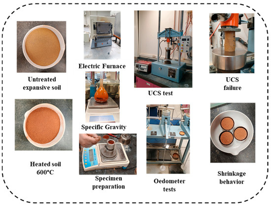 In this study, expansive clay samples were subjected to controlled heating at target temperatures of 200 °C, 400 °C, and 600 °C, with an exposure duration of 120 min at each temperature. The selection of these temperature gradients was based on established findings from the geotechnical literature regarding the thermal decomposition of the dominant clay minerals identified in the soil [2,16,18,26,27]. The 200 °C level was chosen to investigate the effects of removing physically adsorbed water, where only minimal structural change is expected. The 400 °C threshold is a critical temperature recognized as the approximate onset of dehydroxylation in kaolinite, a process where the crystalline structure begins to break down and the mineral can become non-expansive. Finally, the 600 °C level was selected to ensure the near-complete and irreversible transformation of kaolinite into its non-expansive, amorphous metakaolin phase, a temperature at which other expansive soils have also shown significant and permanent improvement. This stepped approach, grounded in previous research, allows for a systematic evaluation of the soil’s properties at distinct stages of its thermal transformation.