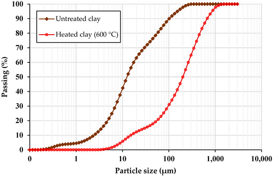 Figure 2 illustrates the particle size distribution obtained from laser diffraction particle size analyzer conducted on untreated expansive clay and clay heated to 600 °C. It is evident from the curves that thermal treatment significantly altered the particle size characteristics of the soil. The untreated clay displays a relatively finer gradation with approximately 50% of particles smaller than about 12 µm, while the expansive clay heated to 600 °C exhibits coarser particles, where approximately 50% of the particles are smaller than around 200 µm. The observed alterations in particle size distribution following thermal treatment at 600 °C are consistent with findings from previous studies on expansive soils [19,25]. This shift towards coarser particle sizes following heating may be attributed to the aggregation of soil particles and structural changes, including mineralogical transformations and dehydration, induced by exposure to elevated temperature.