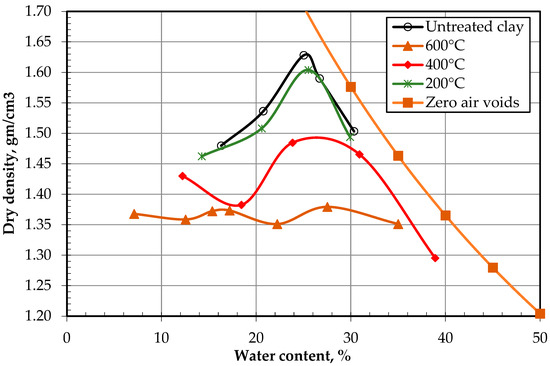 Compaction tests results for untreated expansive soil and heat-treated soil samples for at 600 °C, 400 °C, and 200 °C.
