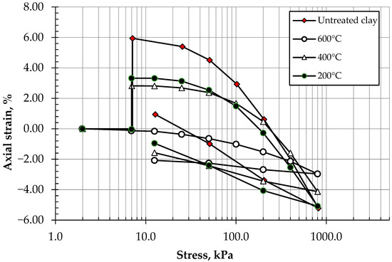 The most substantial reduction in swelling occurred at 600 °C (G600), where initial swelling strains were markedly minimized, approaching zero under the low initial stress and eventually showing slight compression even at relatively low stresses. This indicates a near-complete elimination of expansiveness, reflecting significant structural and mineralogical alterations from high-temperature exposure.