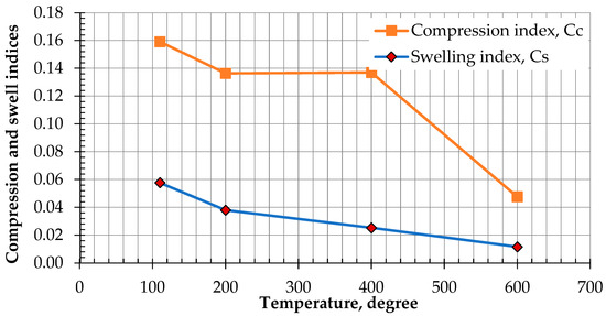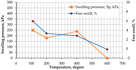 Collectively, these figures demonstrate that thermal treatment significantly mitigates the expansive nature of the soil. The reduction in compression index, swelling index, free swell, and Sp indicate a fundamental alteration in the soil’s structure and/or mineralogy due to heating, rendering it less susceptible to volume changes upon variations in moisture content. The results suggest that heating, especially at temperatures exceeding 400 °C, could be an effective ground improvement technique for controlling the problematic behavior of expansive soils.