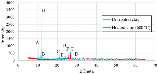 XRD analysis for untreated expansive soil and heat-treated soil sample for 2 h at 600 °C. (A = illite; B = kaolinite; C = Quartz; D = Calcite; E = Dehydrated clay phases; F = Transformed kaolinite).