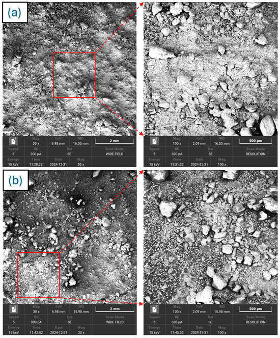 SEM images at 30× and 100× magnifications on the left and right sides, respectively: (a) untreated expansive soil; and (b) heat-treated soil for 2 h at 600 °C.