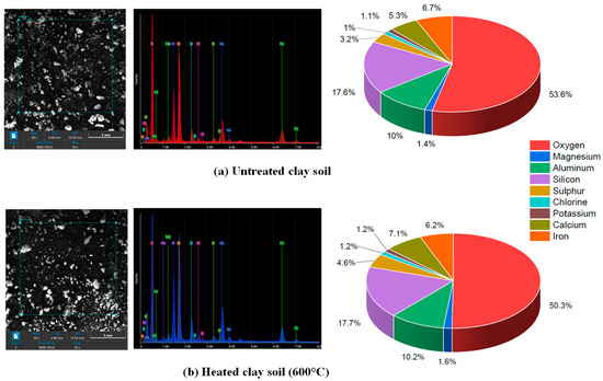 Figure 9 shows the SEM images of the soil in its untreated state and after heating at 600 °C for 2 h. SEM images reveal distinct microstructural changes occurring in the clay soil following thermal treatment at 600 °C. The untreated clay soil (Figure 9a) exhibits a relatively smooth and cohesive surface texture with fine-grained particles arranged in a compact matrix. The microstructure shows the characteristic platy morphology of clay minerals with overlapping sheets and minimal visible porosity at the observed magnification.