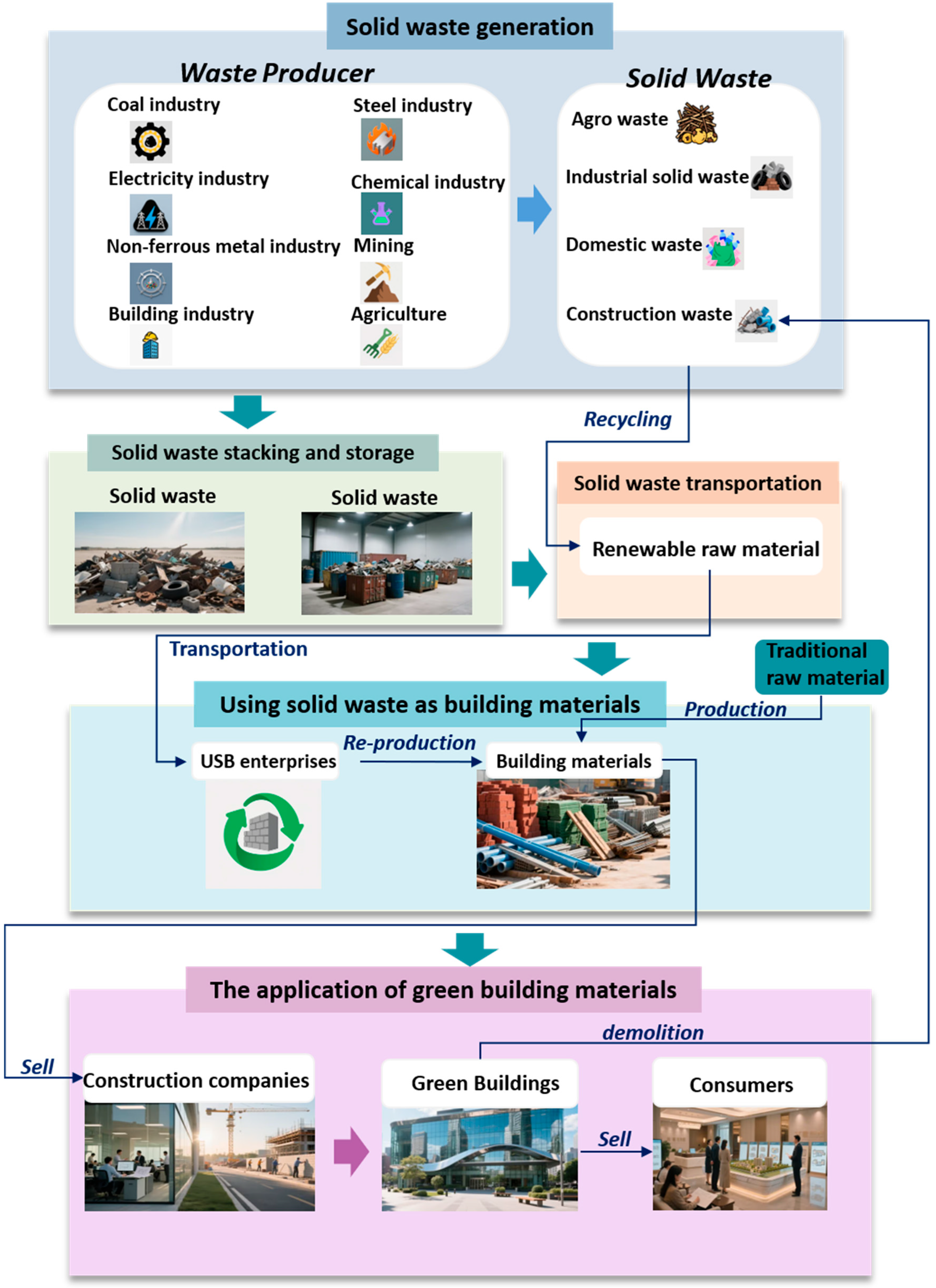 Guiding Opinions on Accelerating the Comprehensive Green Transition of Economic and Social Development | Vigorously promote the green and low-carbon transformation of iron and steel, non-ferrous metals, petrochemicals, chemicals, building materials, paper, printing, and dyeing industries; promote energy-saving, low-carbon, and cleaner production technology and equipment; promote the updating and upgrading of processes. | At present, solid waste recycling enterprises generally lack clean production mechanisms and sustainable development systems for the use of building materials, especially in the pre-treatment of raw materials, recycled aggregate processing, and other key aspects. This failure to establish standardized, low-carbon operating norms restricts the efficiency of the transformation of solid waste resources into high-quality building materials. | Unclear mechanisms to achieve cleaner production and sustainable development of enterprises. | Management | |