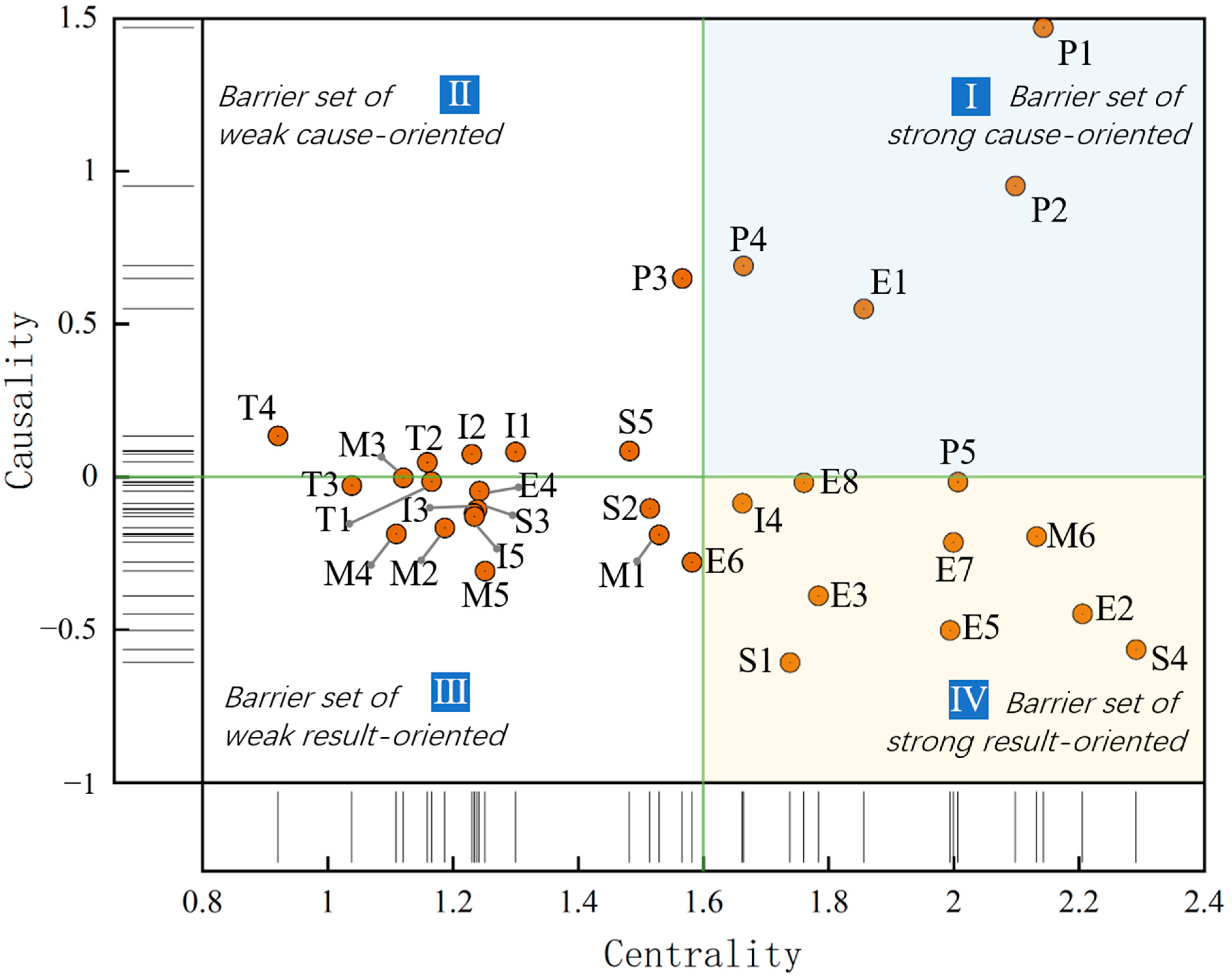 E1 | P2, P4, P5, E1, E2, E3, E4, E5, E6, E7, E8, S1, S2, S3, S4, S5, M1, M2, M4, M5, M6, I4 | P1, P2, P3, E1, M6, I4 | P2, E1, M6, I4 | II |