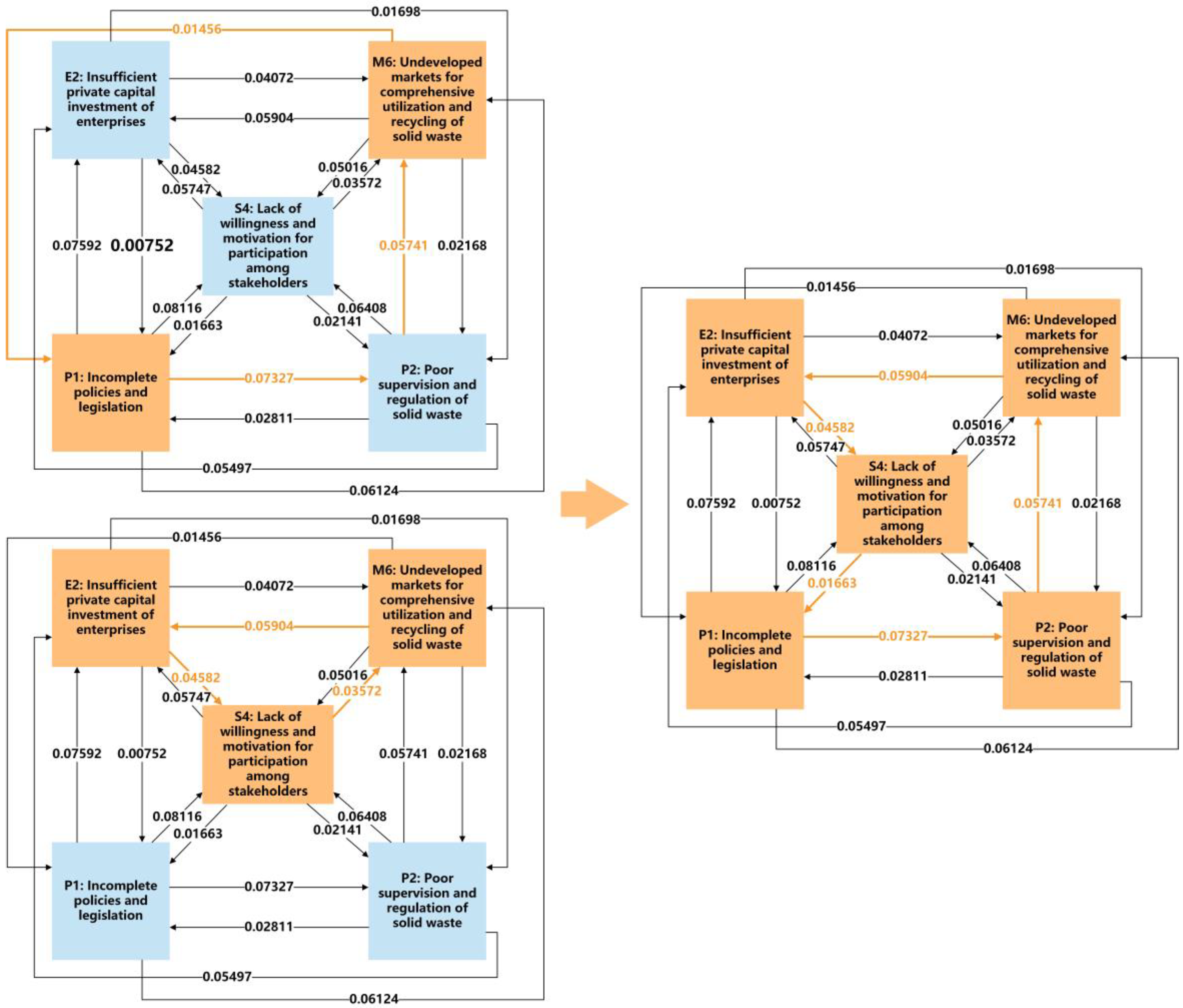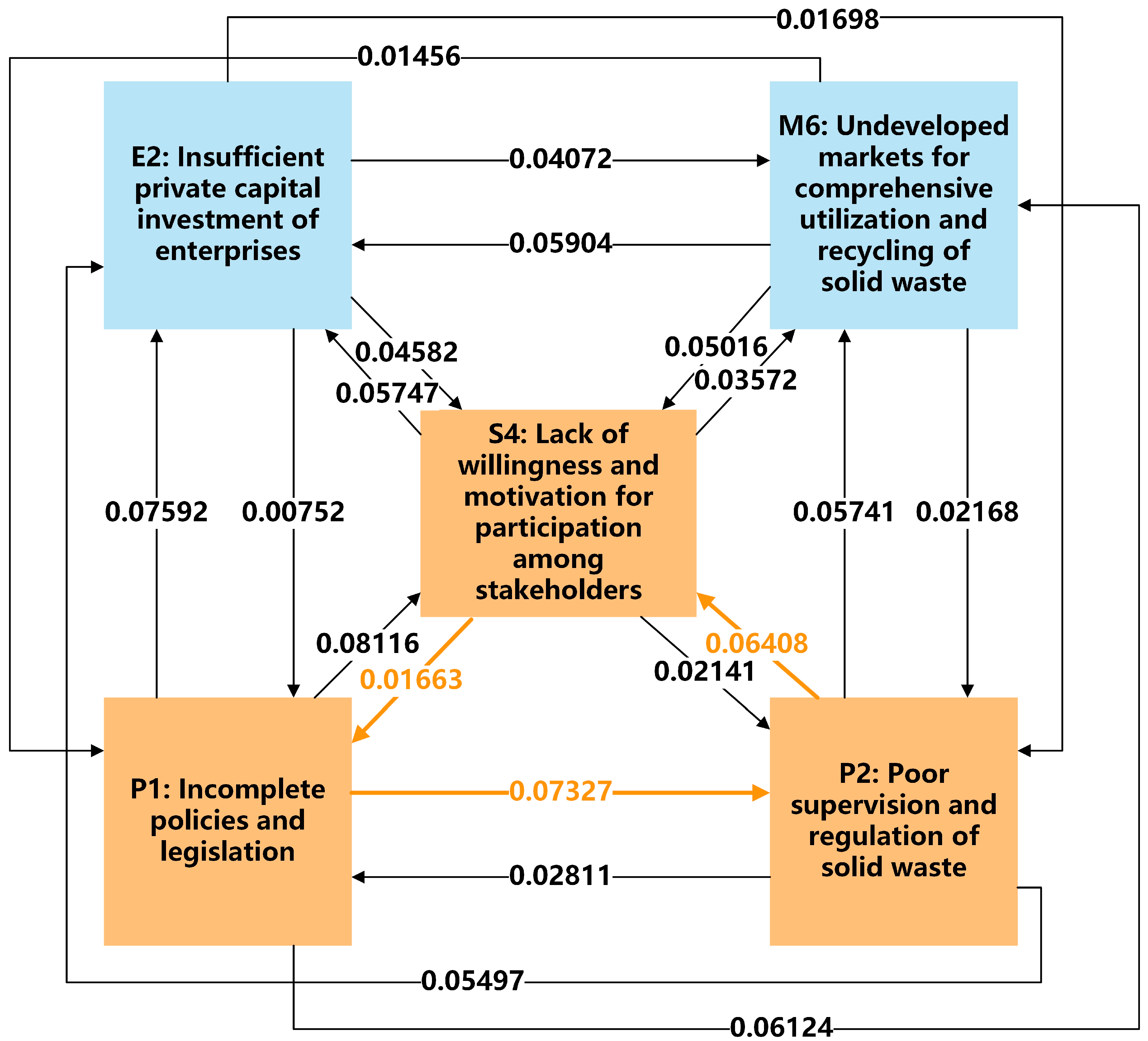 Information (I) | Limited knowledge among suppliers and demanders about recycling trading channels and supply chain of solid waste | I1 | TCT, RBT, SNT | [52,59] |