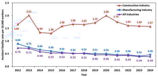 The construction industry plays a key role in the economic development of countries worldwide but is also recognized as one of the most hazardous sectors in terms of occupational safety [,,]. Construction project scales have continued to expand in size and complexity, with multiple processes frequently occurring simultaneously at a single site [,]. These overlapping activities increase not only the potential for operational interference but also the occurrence of safety-related issues [,]. According to accident fatality rates per 10,000 workers in the construction industry across the ten major OECD countries in 2023, the rates were at least twice as high—and in some cases nearly six times higher—than those observed across all industries combined. As shown in Figure 1, the construction industry of South Korea reported an accident fatality rate of 1.59 per 10,000 workers, the highest among OECD countries []. Using industrial accident data announced by the Ministry of Employment and Labor of South Korea, the change in South Korea’s accident fatality rate is shown in Figure 2.
