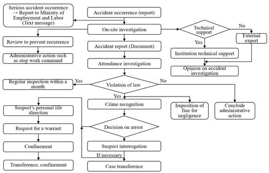 When a major construction accident occurs, the contractor is required to conduct an accident investigation and report it to the government, while the government investigates whether there has been a violation of the law. Figure 3 shows the serious accident investigation process in South Korea. Examining this process, it is clear that the accident investigation primarily focuses on determining whether the site managers violated the law, as regulated in the Occupational Safety and Health Act (OSH Act). This process, which views determining legal violations by the accident site as a vital control function, has some limitations []. It fails to apply the perspective of “Why was adequate control not exercised?” and “Why was improper control exerted?” and is unable to establish preventive measures suitable for the specific characteristics of the site where the accident occurred []. Additionally, accident investigation reports have not been publicly released, posing difficulties in their utilization for serious accident reduction. Thus, the current accident investigation methods make it difficult to find the root causes, especially in cases involving various stakeholders, such as dismantling work, making it challenging to identify the fundamental and systematic causes of accidents.