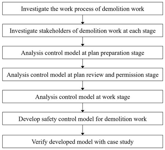 While past studies relating to STAMP show its applicability to the overall construction process, there is limited research on accident analysis for specific construction processes such as building demolition work. This study focuses on developing an advanced safety control structure to identify stakeholders participating in building demolition in South Korea and provides a STAMP-based analysis template that can be used in the accident analysis process. The research procedure is presented in Figure 5. First, the work process and stakeholders for demolition work in South Korea were investigated. Next, the safety control structure using the stakeholders and work process was identified at each construction stage, and the advanced model was developed for the whole demolition work process; we verified the model by applying a real accident case that occurred in South Korea.