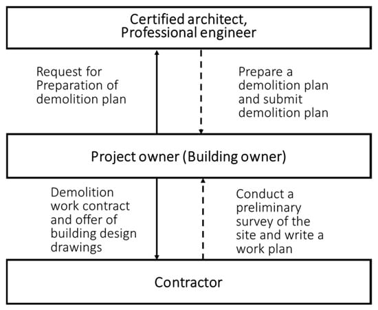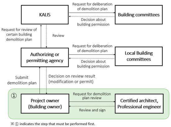 In the plan preparation stage, the project owner, contractor, certified architect, and professional engineer should cooperate to establish a demolition plan. In particular, the demolition plan should be prepared by a certificated architect or a professional engineer. In the review and permitting stage, the specialized review organization is included as a stakeholder. In the case of building demolition that requires a permit rather than notification, a specialized review organization is responsible for the review, and the specialized review organization in South Korea is KALIS (Korea Authority of Land & Infrastructure Safety). The supervisor and external inspectors are included in the process of demolition work to control it.