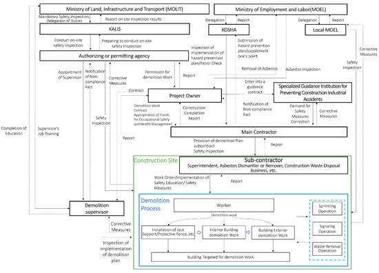Demolition work was divided into various stages, each involving different stakeholders (see Table 1). These stakeholders participate in accordance with the laws in South Korea. There are various laws related to demolition work, such as the “Building management Act (BM Act)”, “Occupational safety and health Act (OSH Act)”, and “Construction waste recycling promotion Act (CWRP Act)”. These stakeholders must comply with the requirements for their legal roles and implement respective safety measures to ensure a safe demolition.