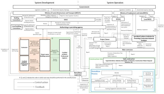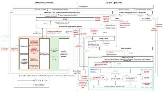 The components of the safety control structure of demolition work were derived. To prevent stakeholders from being omitted from the model, the structure of each stage was first analyzed before deriving the final model. Each model was assigned interactions of stakeholders by referring to major laws related to demolition work, such as the BM Act, OSH Act, and CWRP Act. Furthermore, the definitions of “control measures” and “feedback” used in this study were primarily derived from Leveson’s STAMP framework (2004) [] and supplemented with regulatory text analysis of the Building Management Act (BM Act) and the Occupational Safety and Health Act (OSH Act).