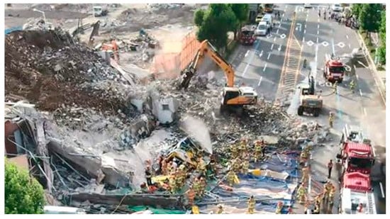 - Central Building Accident Investigation Committee. Gwangju Building Demolition Collapse Accident Investigation Report. 2021. Available online: https://www.molit.go.kr/USR/policyData/m_34681/dtl.jsp?id=4559 (accessed on 1 September 2025).