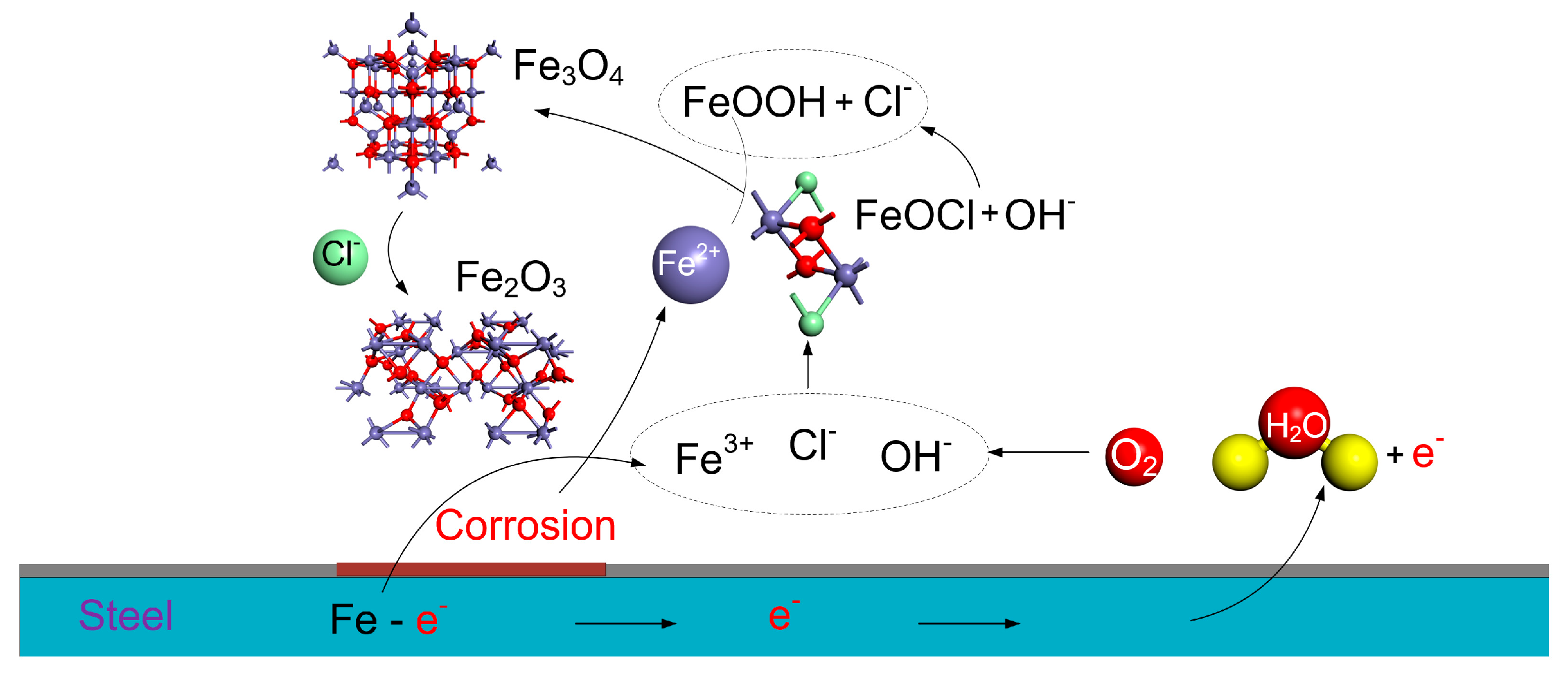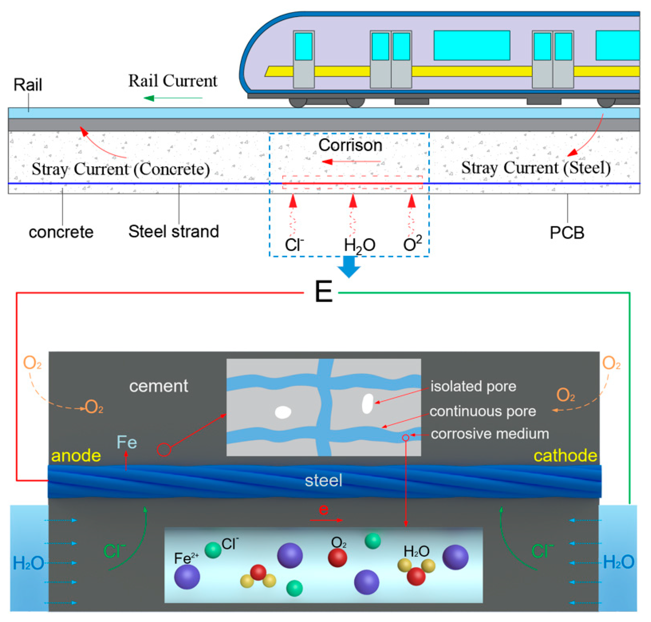 Due to the presence of stray current, chloride ions in the environment rapidly invade the interior of the concrete through the pore structure of the concrete, causing the corrosion of the steel bars or prestressed tendons. The electrochemical corrosion process of steel strands is shown in Figure 13.
