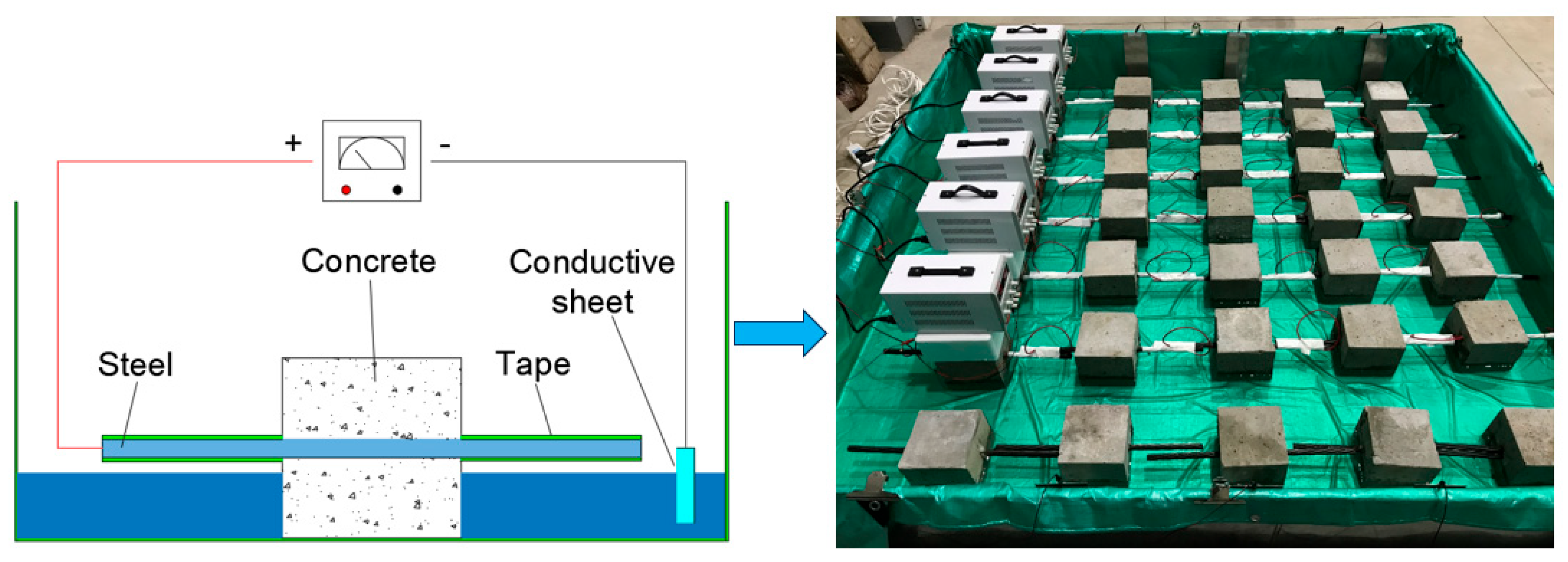 The corrosion test in this study was set up by placing the concrete specimens in a NaCl solution and passing a direct current through the steel strands in the concrete to simulate the corrosion process through the coupling of stray current and chloride ions, as shown in Figure 1. An iron sheet was used to make a corrosion pool with dimensions of 2000 mm × 2000 mm × 300 mm. An anti-corrosion cloth was laid inside the pool to ensure that the current and corrosion solution did not react with the pool during the test. The corrosion solution was 5% NaCl. According to research on stray currents [27], constant currents of 20 mA, 40 mA, and 60 mA were applied, respectively, using a direct current power supply. The test times were set to 42 days, 49 days, 56 days, 63 days, and 70 days, respectively. The experimental design is shown in Figure 2.